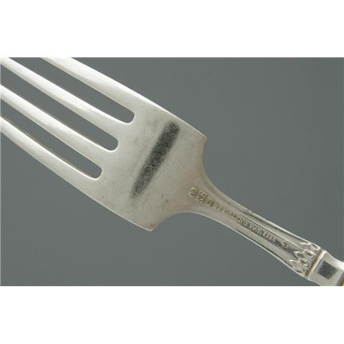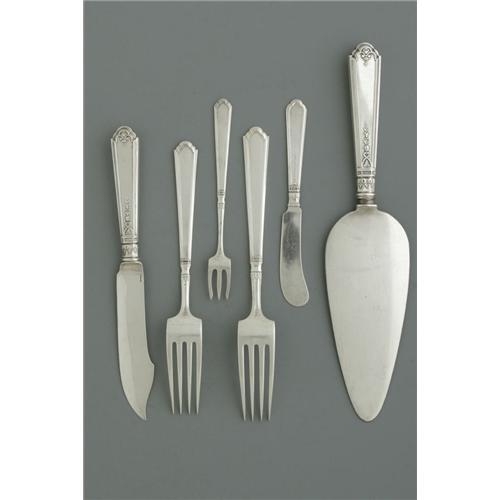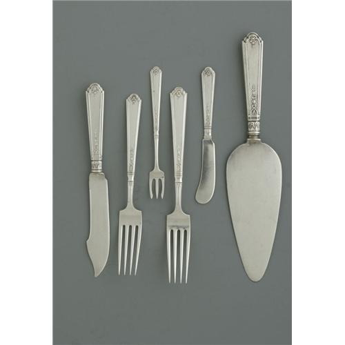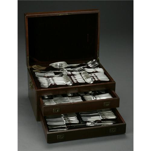 <B>An American Silver Flatware Set</B></I><BR>Mark of Gorham, Providence, RI, 1926<BR><BR>The 'Princess Patricia' pattern set includes a fifteen piece place setting for twelve, plus twenty-three serving pieces, all marked on the reverse and housed in a wooden, velvet-lined presentation box<BR>The dinner knife: 9.5in. long; The box: 22.3in. wide x 12.7in. high x 16.1in. deep
