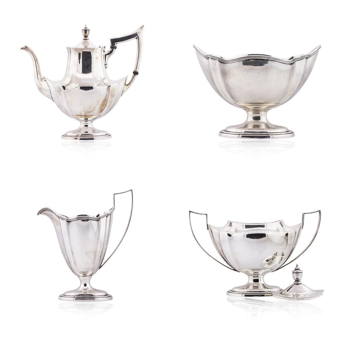 A Gorham sterling silver 5 piece coffee and tea set consisting of a coffee pot, tea pot, cream pitcher, sugar bowl, and waste bowl. Monogrammed PGM.