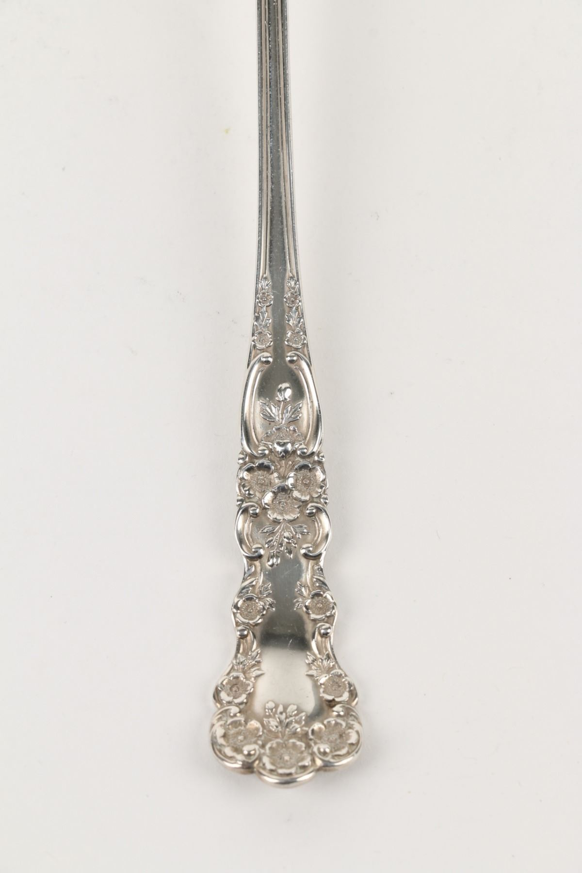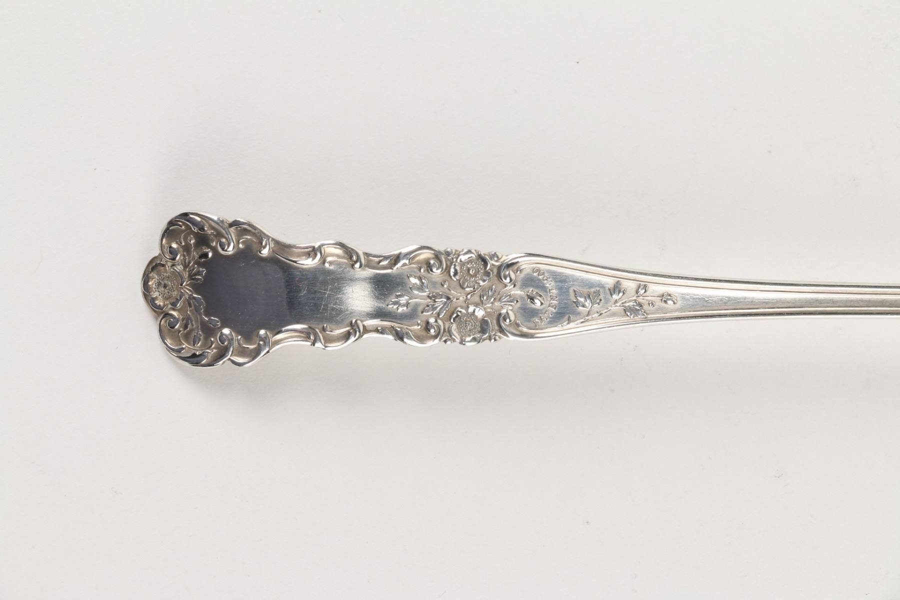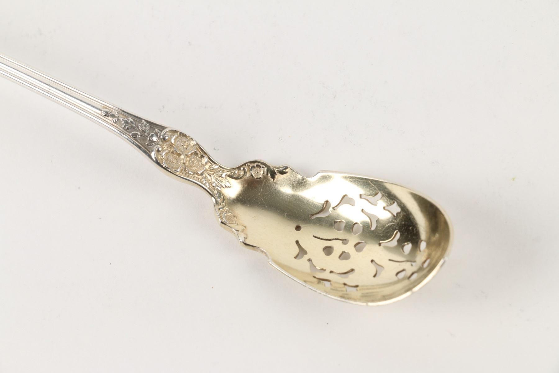 Lot 278 - Circa 1899. Long-handled olive serving spoon. Gold washed bowl. 8.5". Gross weight, 28g. $50-100.