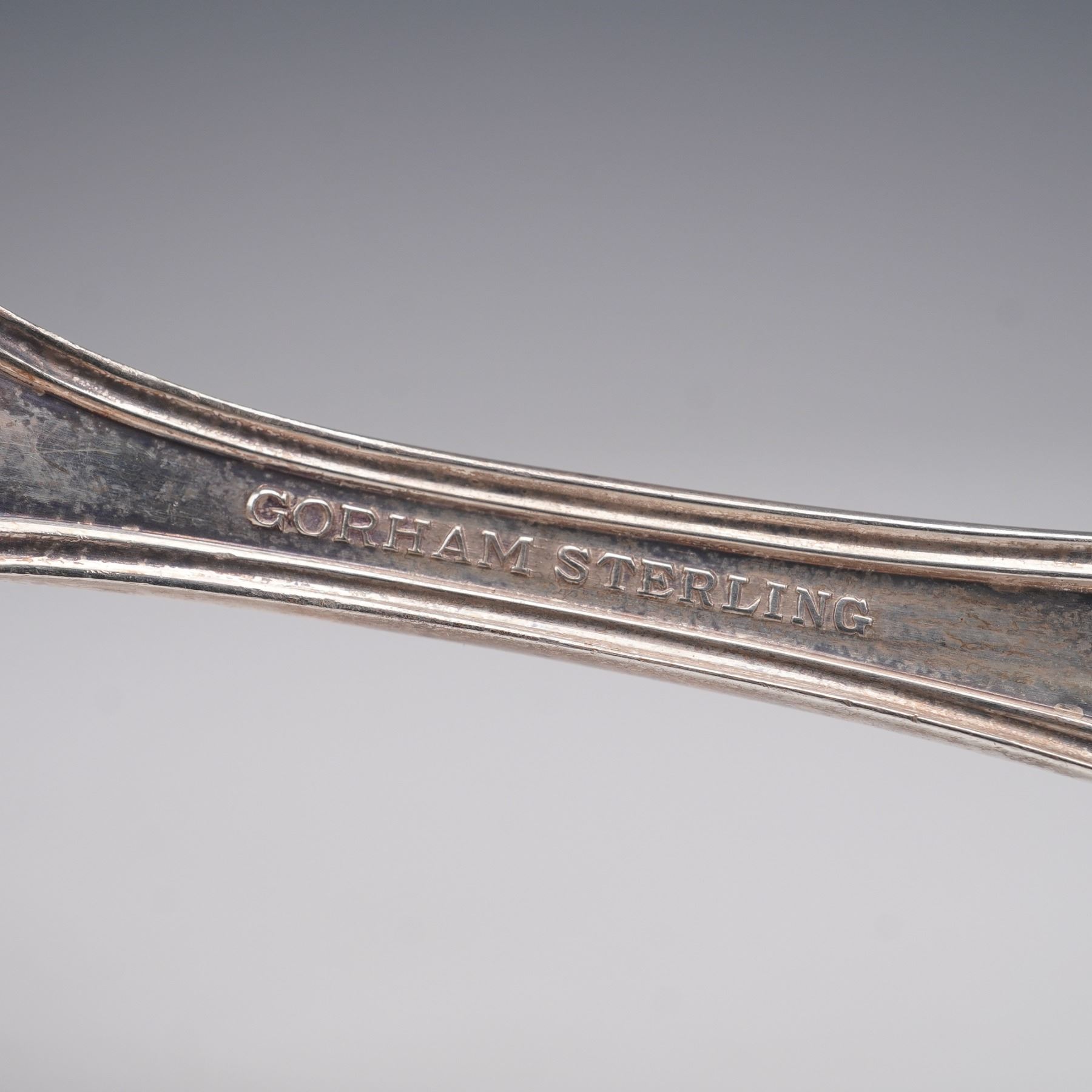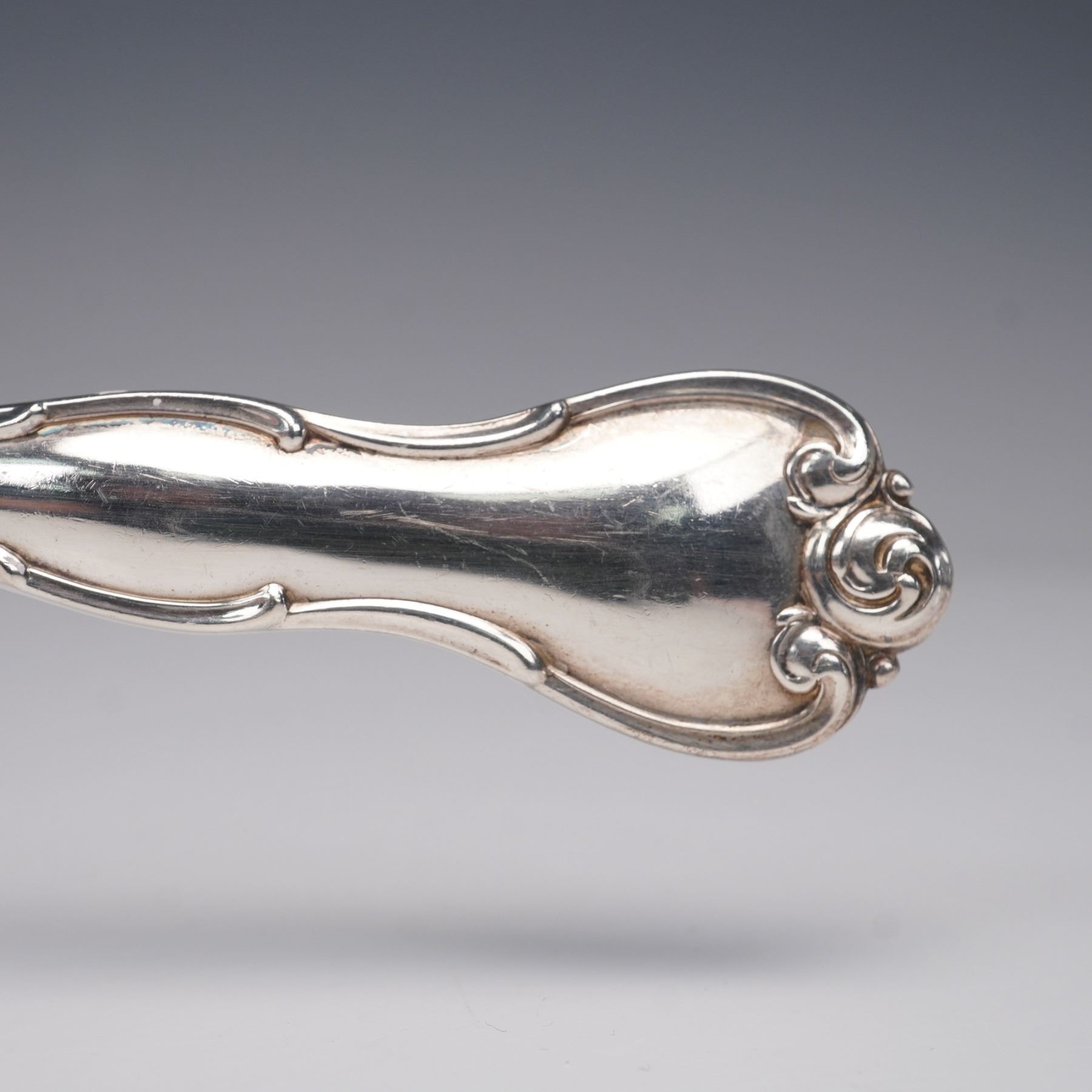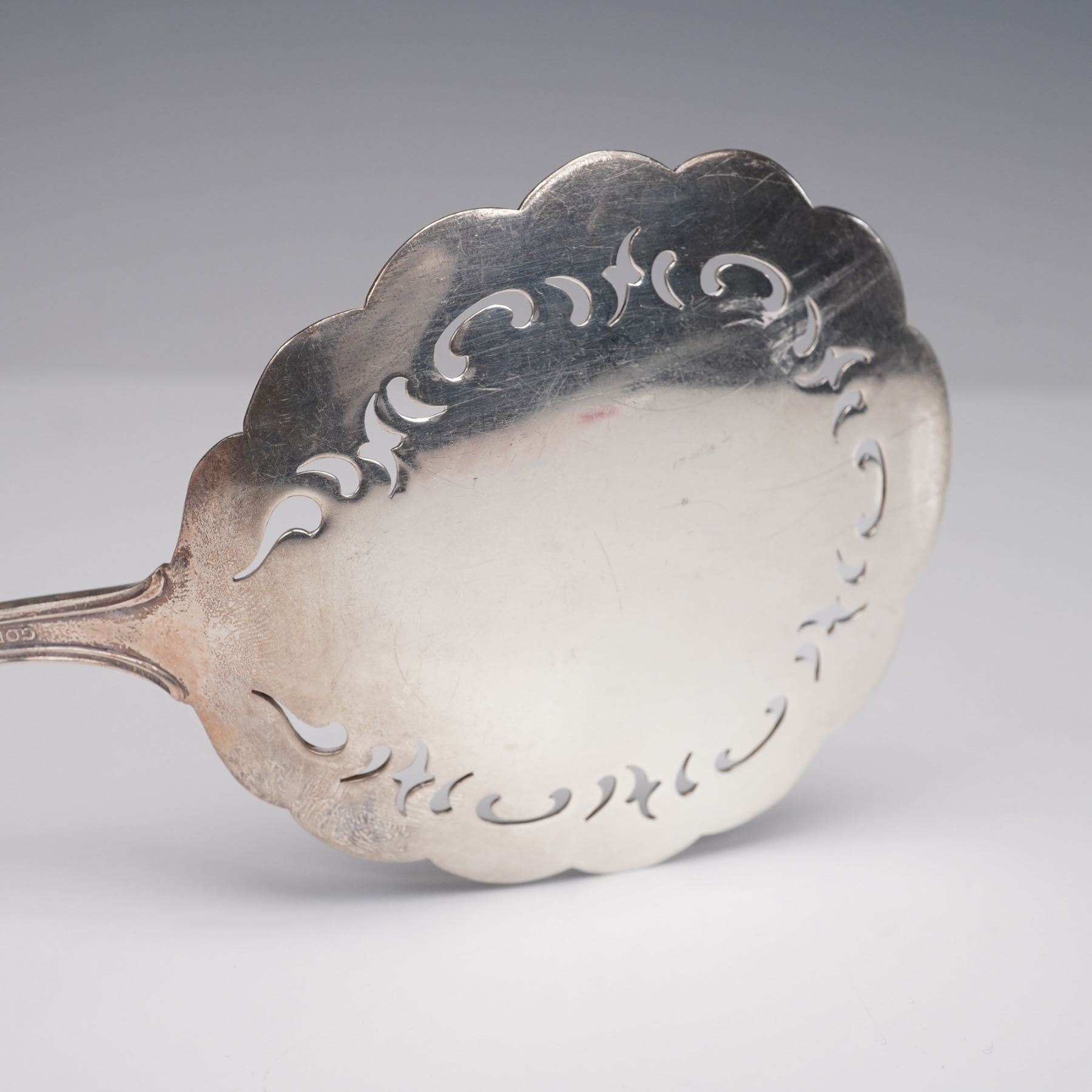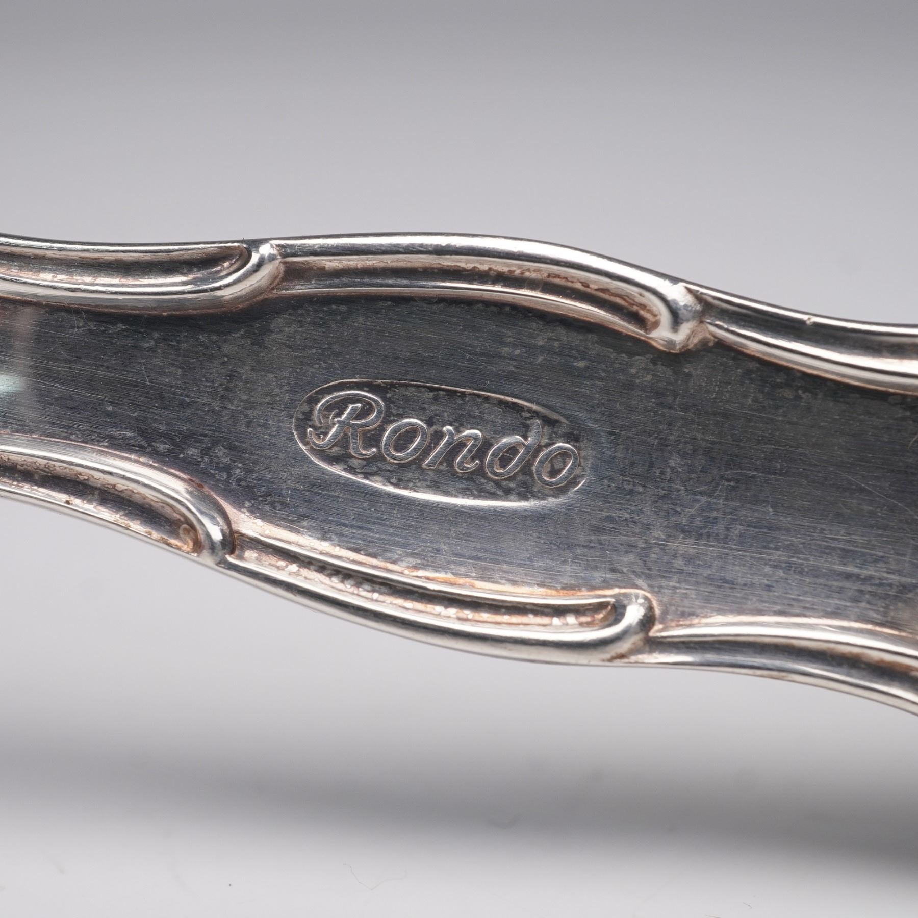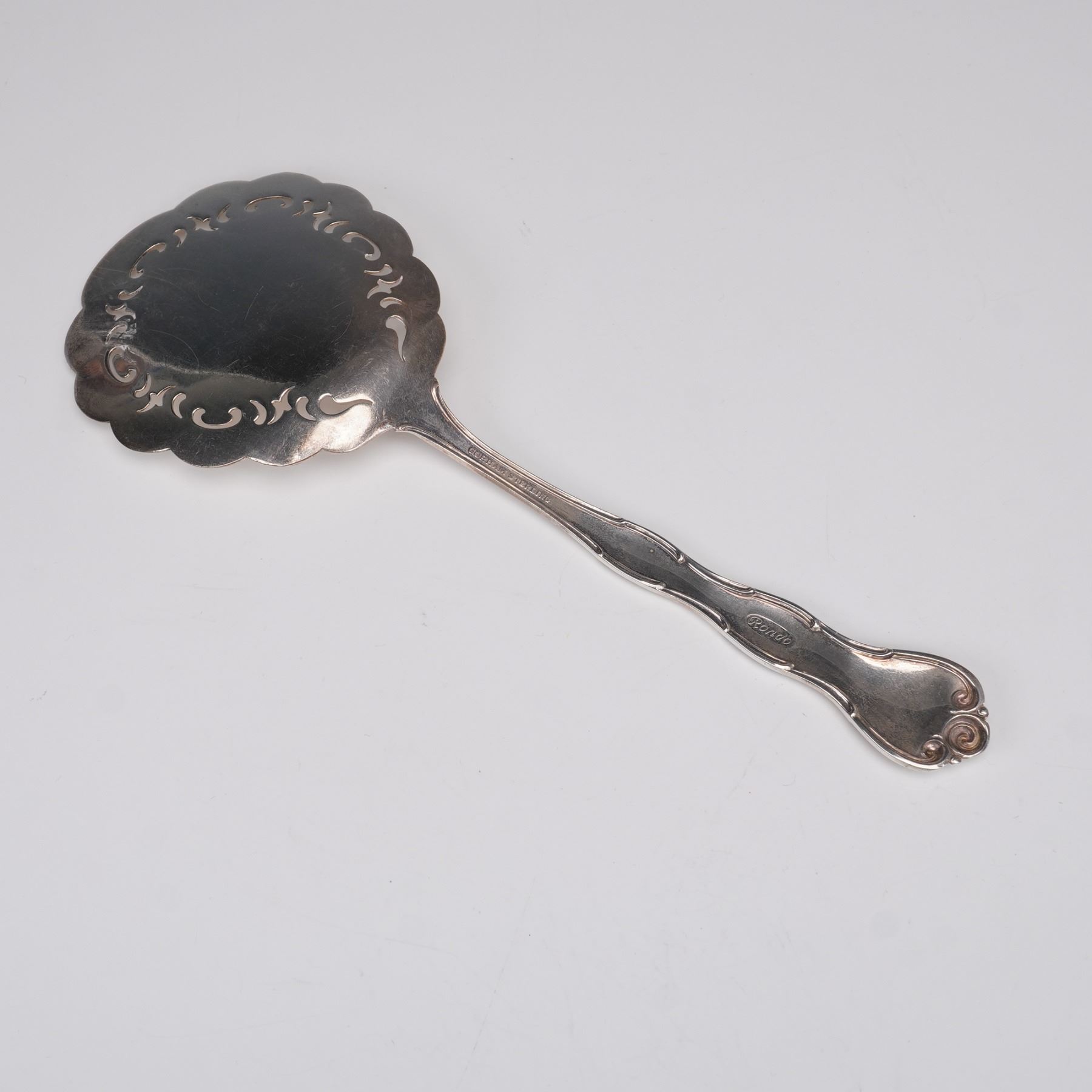 Exceptional sterling silver tomato server in the refined Rondo pattern, featuring a scalloped, flat bowl adorned with pierced scrollwork and a gracefully contoured handle ending in elegant scroll motifs. Marked "Rondo". Hallmarked Gorham Sterling. Net Silver 2.55 tory oz.