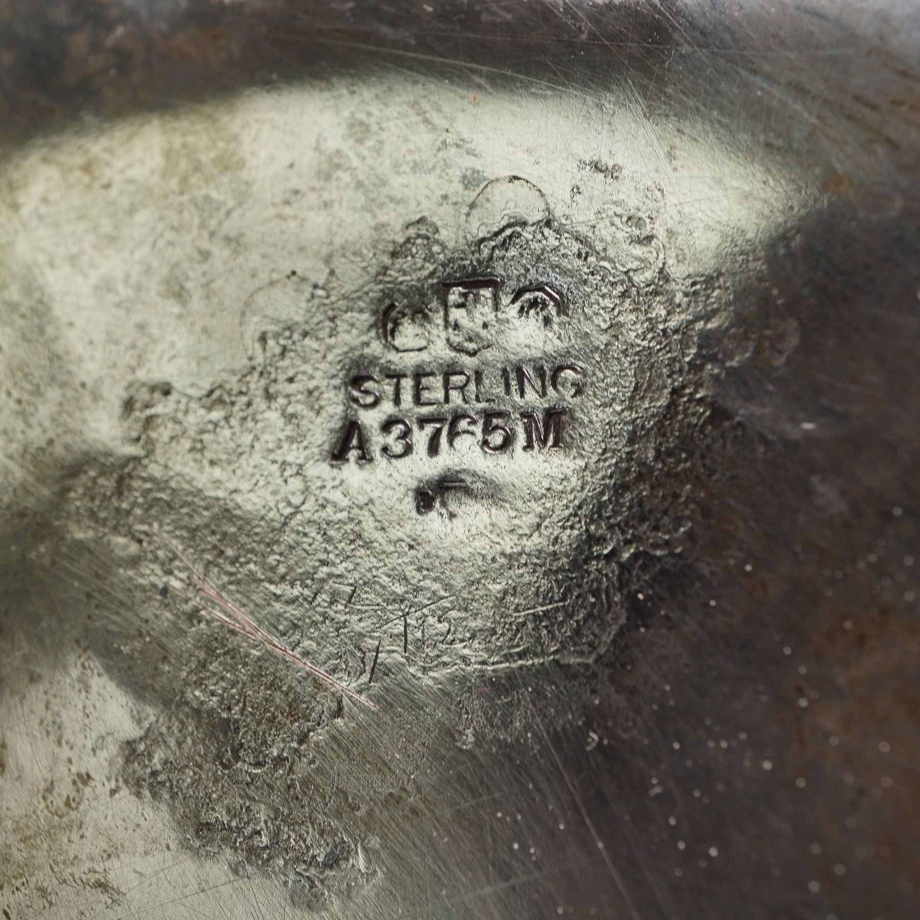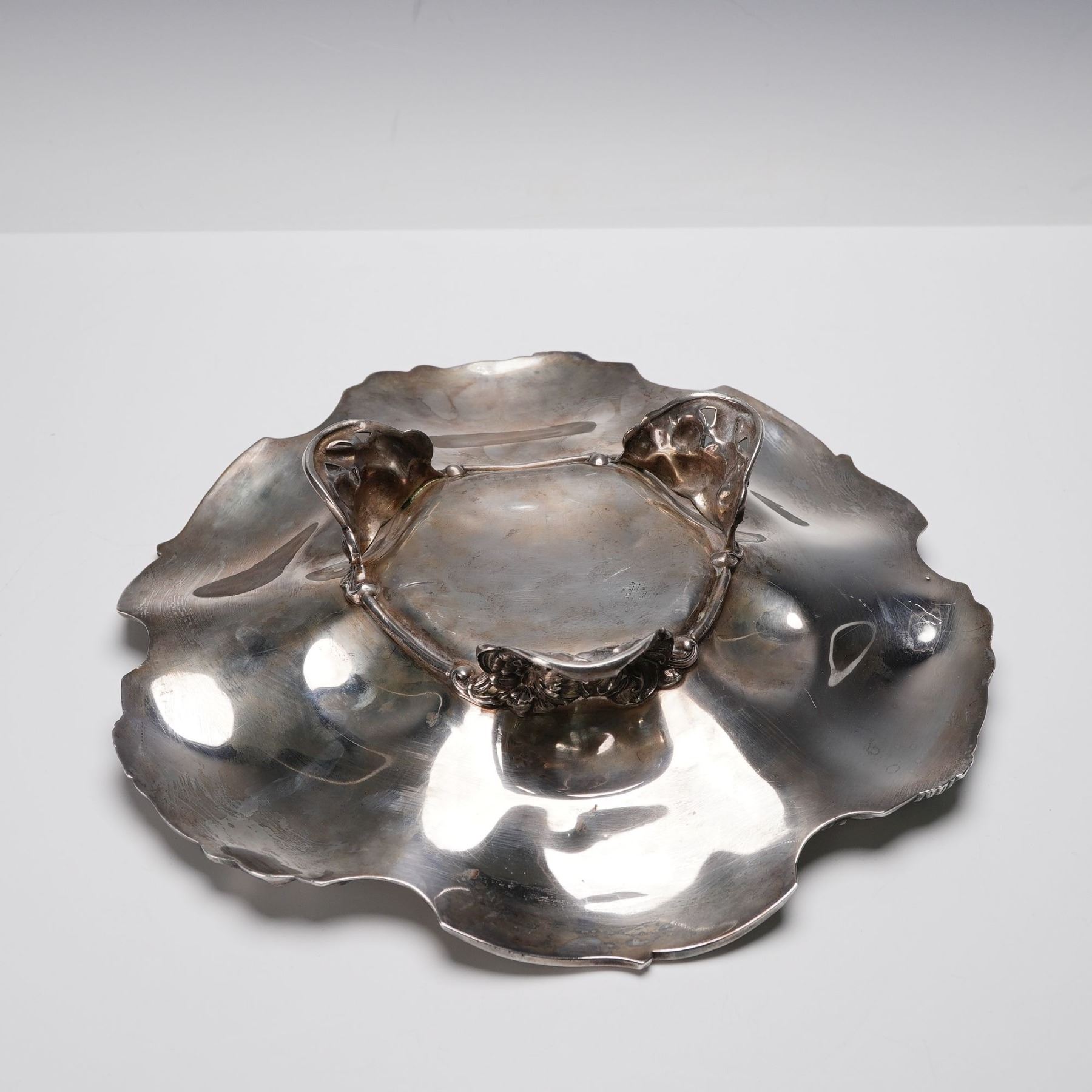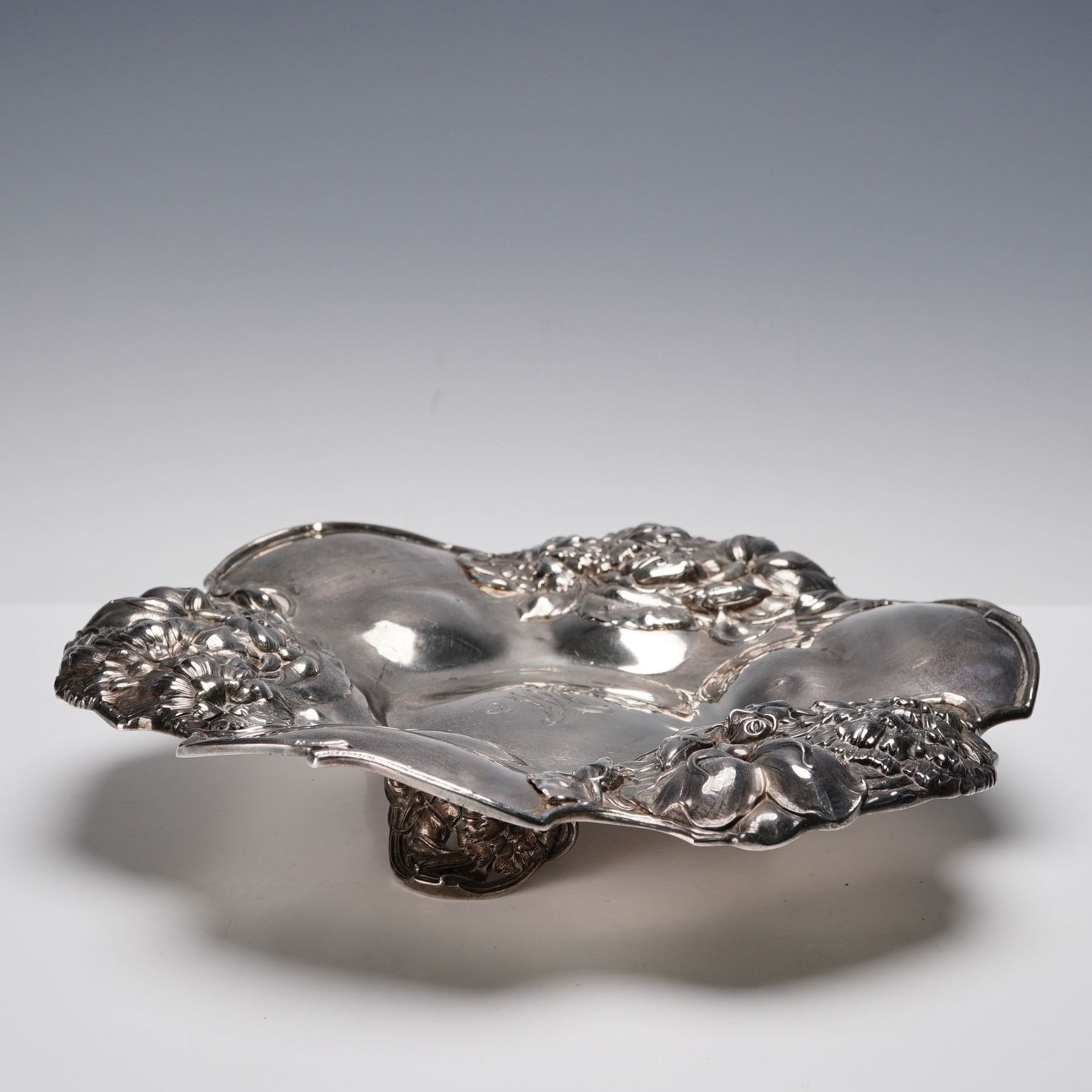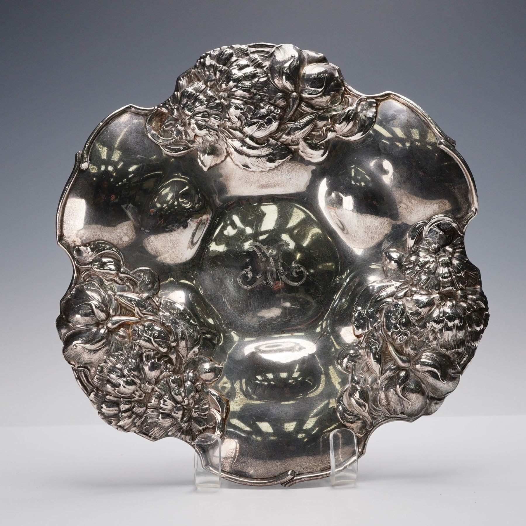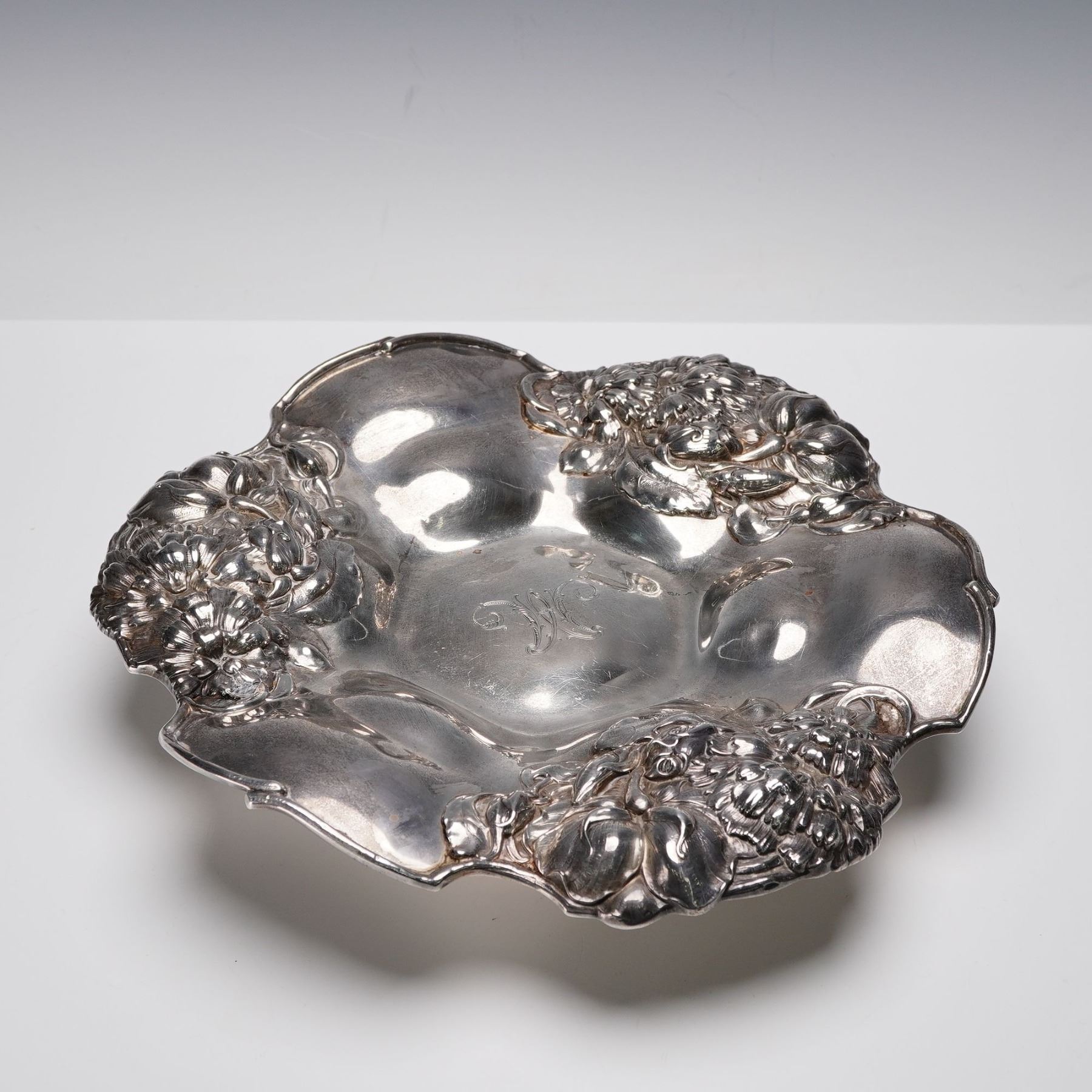 The tray features a scalloped rim decorated with beautifully detailed floral and leaf clusters at the edges. Its shallow, rounded form gives it a graceful flow, while the center bears a delicate monogram. Supported by small raised feet, this refined piece showcases the craftsmanship and decorative charm of fine American silver. Gorham backstamp. Net weight: 786 g.