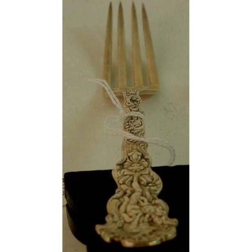 Without a doubt, the marking is Gorham and Sterling, the pattern is probably one of the Versailles pattern multi-motifs. 7 3/4" long, in the center of the ornate handle is a figure sitting astride an object that is hard to determine what it is, their foot rests on the head of another figure, grapes, scrolls, shells, all sorts of themes are around this fork. You are bidding on a set of 12 forks. Old monogram on back of LVV for Lottie Van Vleck.