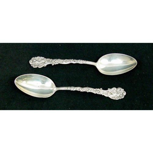 Gorham, Sterling, heavy, probably Versailles pattern with a seated figure holding shocks of wheat, 2 tablespoons, 8 1/2" long. Monogram on back of LVV for Lottie Van Vleck of New York.