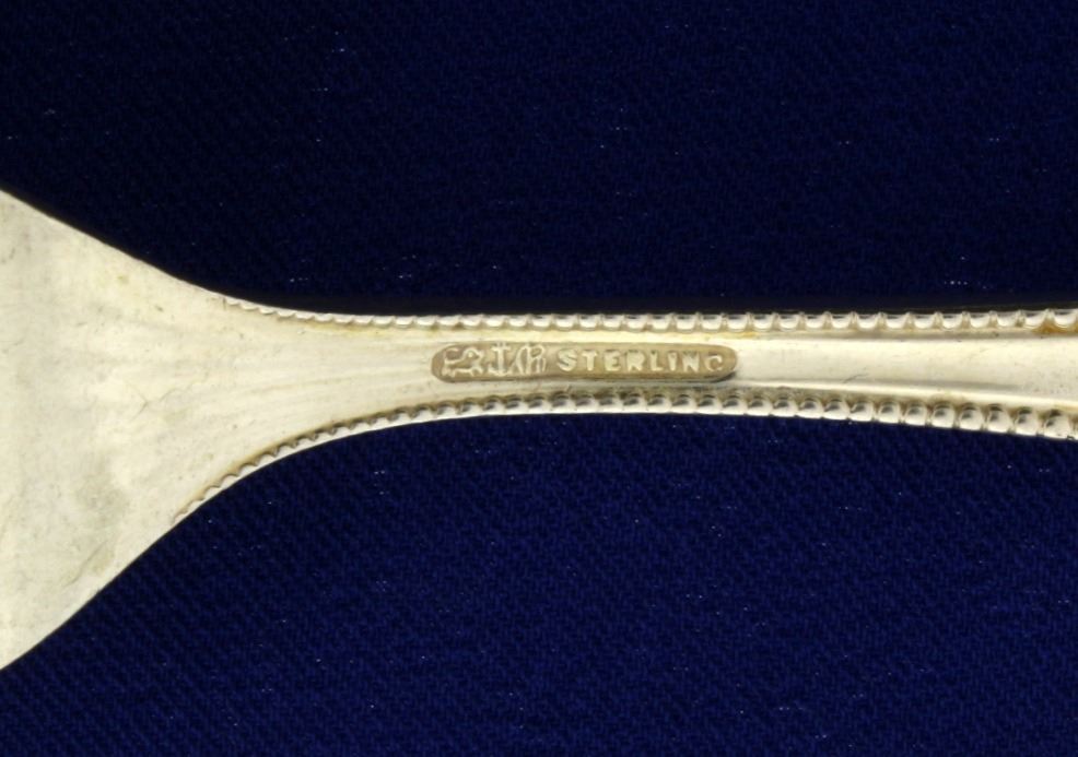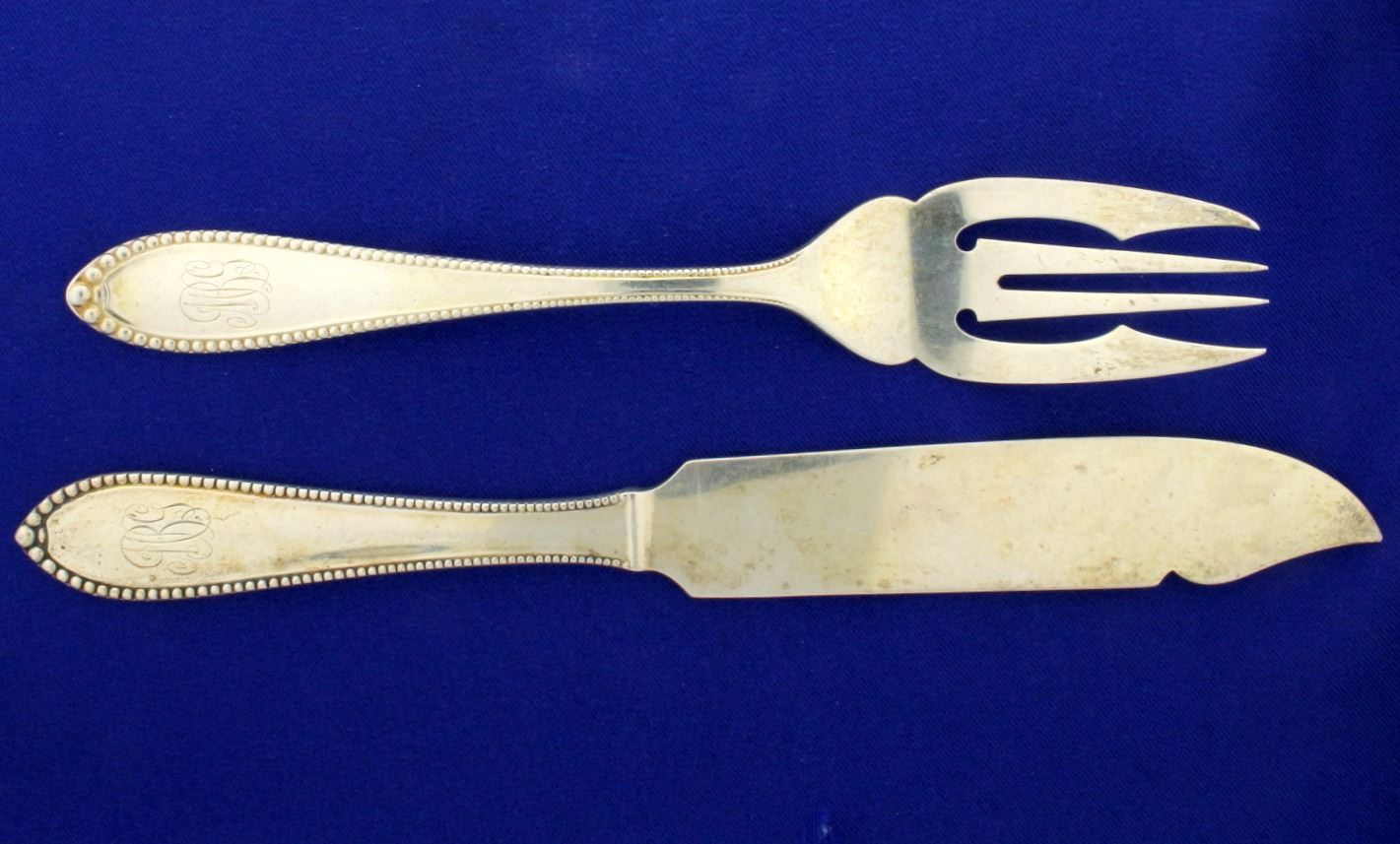 10-fish forks (Salad forks)- 6 5/8 ", solid sterling silver. 11- fish knives-8"- flat handle, solid sterling silver. This set is engraved "1893" and stamped "sterling" with the old makers marks. There is a monogram on all pieces as shown. All pieces are solid sterling silver and in great condition.  1,228g.