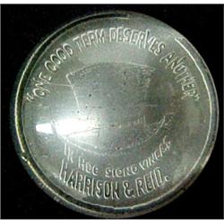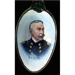 Gorham enameled sterling spoon "Dewey" portrait in bowl; and a glass paperweight for Harrison & Reid reelection "One Good Term Deserves Another" (1892), (surface scratches on top) Estimate 80/140