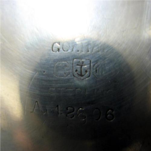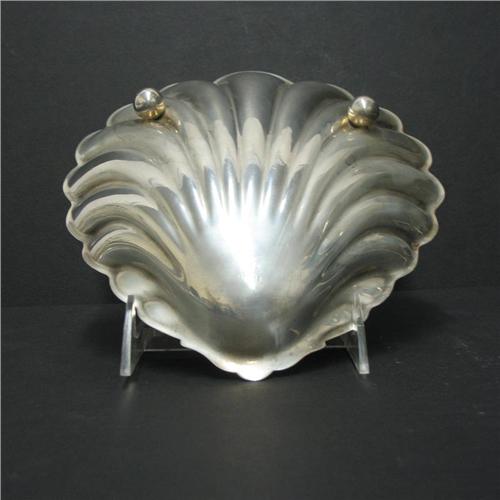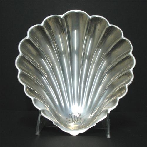 Gorham sterling silver clamshell serving bowl; ball feet; initialed; impressed Gorham Sterling on bottom with maker's mark; A12606; early 20th C.; 1 1/2" high x 7 1/2" x 9"; 12.6 troy oz.; no visible defects