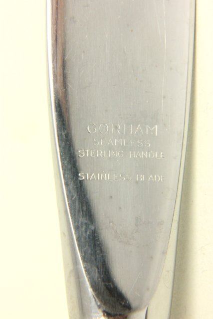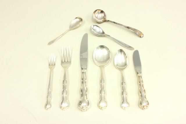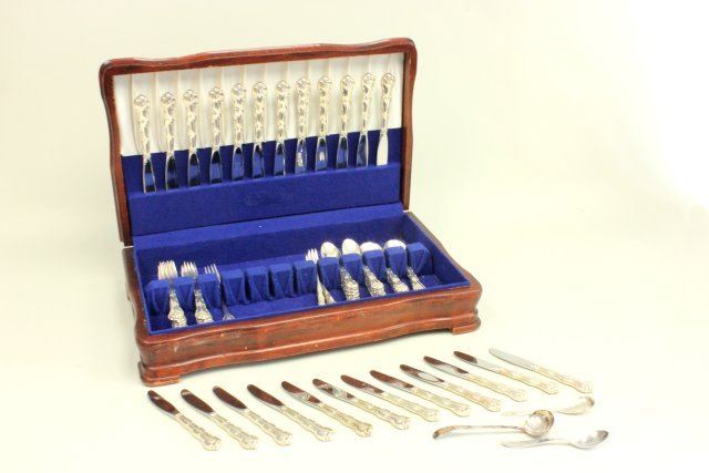 Including 11 dinner forks, 12 salad forks, 24 teaspoons, 12 soup spoons, 11 cocktail forks, 12 butter knives & 12 knives in box. Approx. 84 ozt. From the Estate of Charlotte Thomas. Good condition.