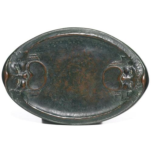 Gorham tray, attribution, bronze oval form with nicely sculpted faces at each end, excellent original patina,9.5in.l