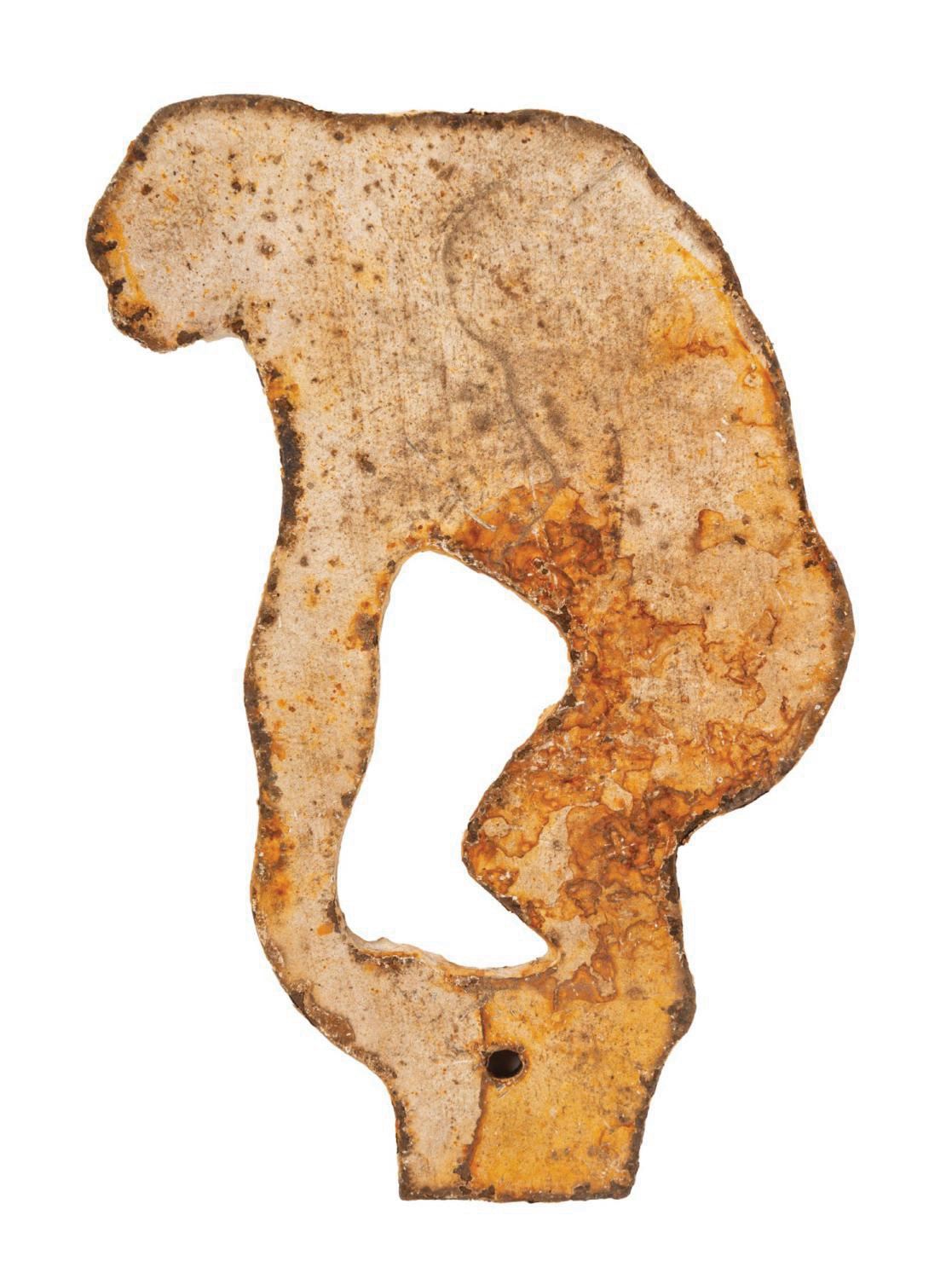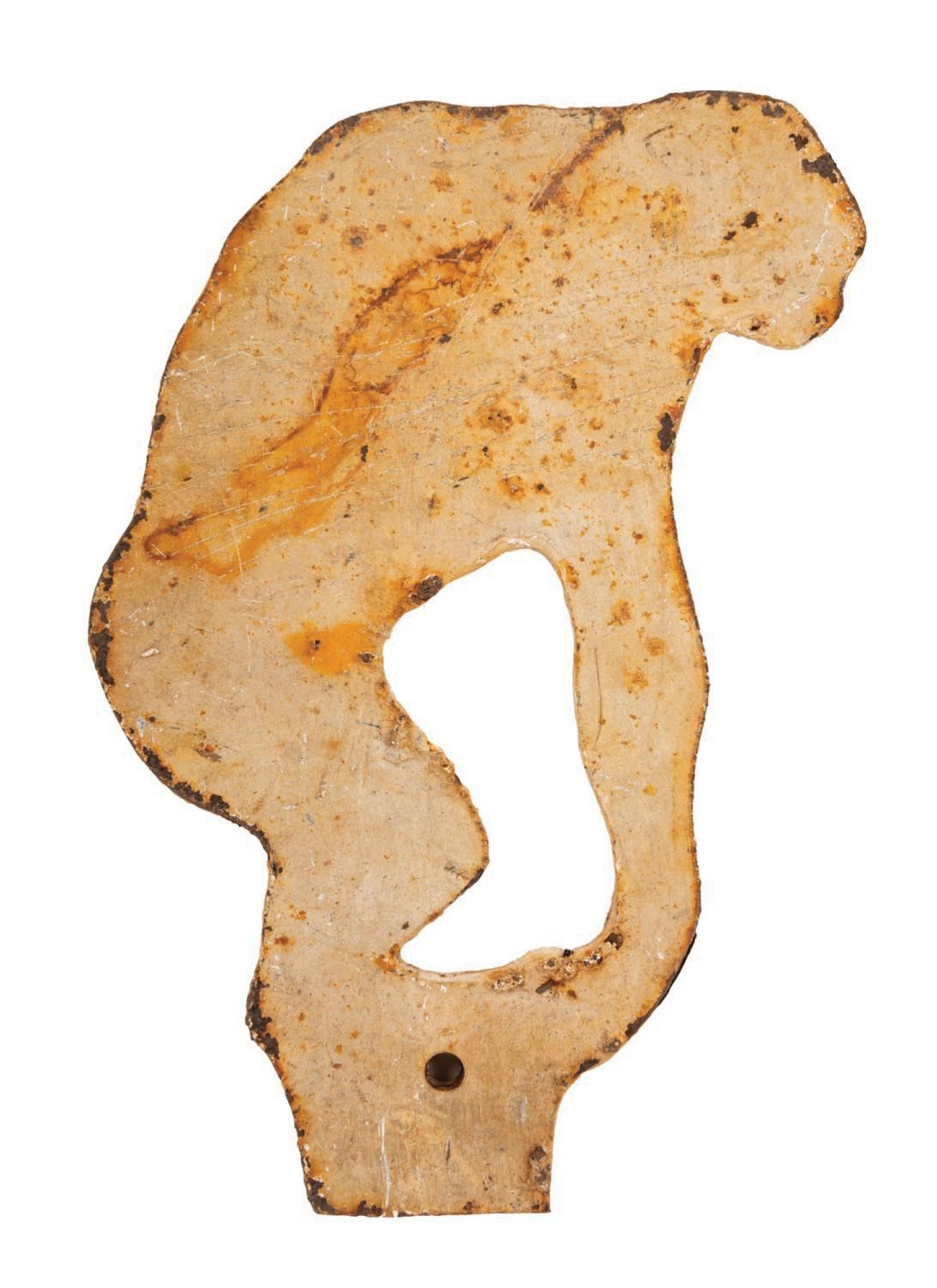 (Disneyland, c.1962-82) An original metal target from the Big Game Safari Shooting Gallery in Adventureland. The ape-shaped target measures 7.25" tall and 5" at its widest point. It is in good condition, with wear and oxidation.