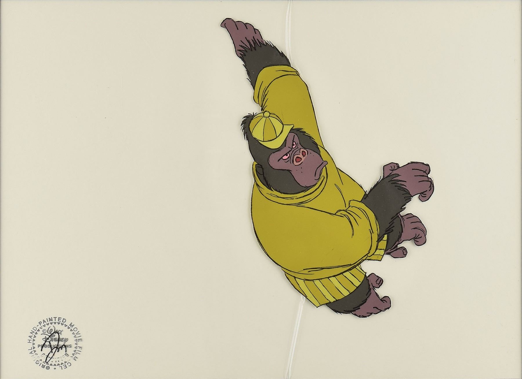 (Walt Disney Studios, 1971) Large original production cel featuring the Gorilla from Bedknobs and Broomsticks, showing him as the goalie during the soccer match. Image measures 6.5 x 8.25, with a mat opening of 14.5 x 10.5. Archivally framed to an overall size of 20.25 x 16.5. The piece has the silver Walt Disney Company seal to lower left. In fine condition.