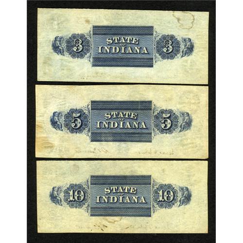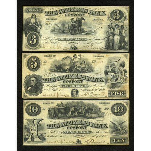 <B>Gosport, IN- Citizens Bank</B></I> $3; $5; $10 July 1, 1857 G6a; G8a; G10a Wolka 252-3; 4; 5<BR> Each note grades <B>About Uncirculated </B></I>with a small water spot. This was one of the most notorious of Indiana's fraudulent banks.<BR><BR><b>Shipping:</b> Coins & Currency (<a target="_blank" href="http://www.heritageauctions.com/common/shipping.php">view shipping information</a>)