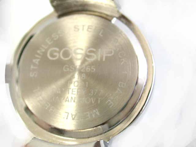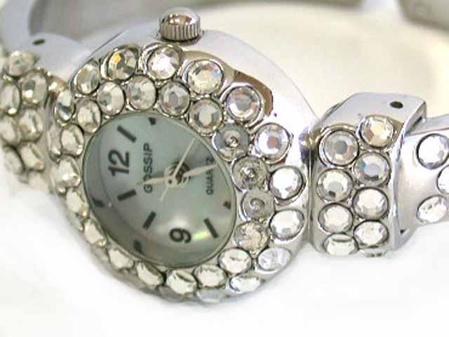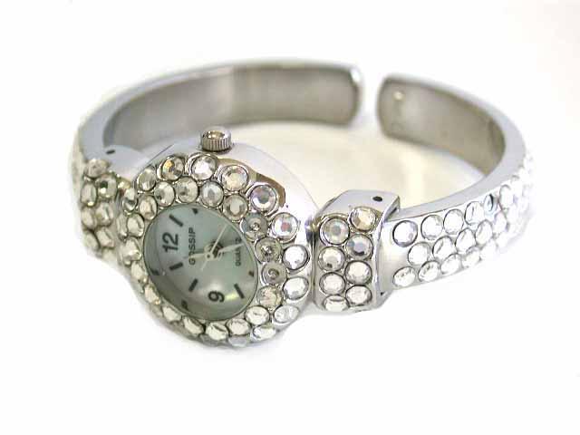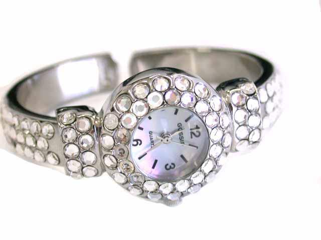 Round crystal bezel; Stainless steel case back; White mother-of-pearl dial; Arabic and Roman number hour markers; hour, minute, and second hands; Japanese movement; Fits an average-sized wrist.