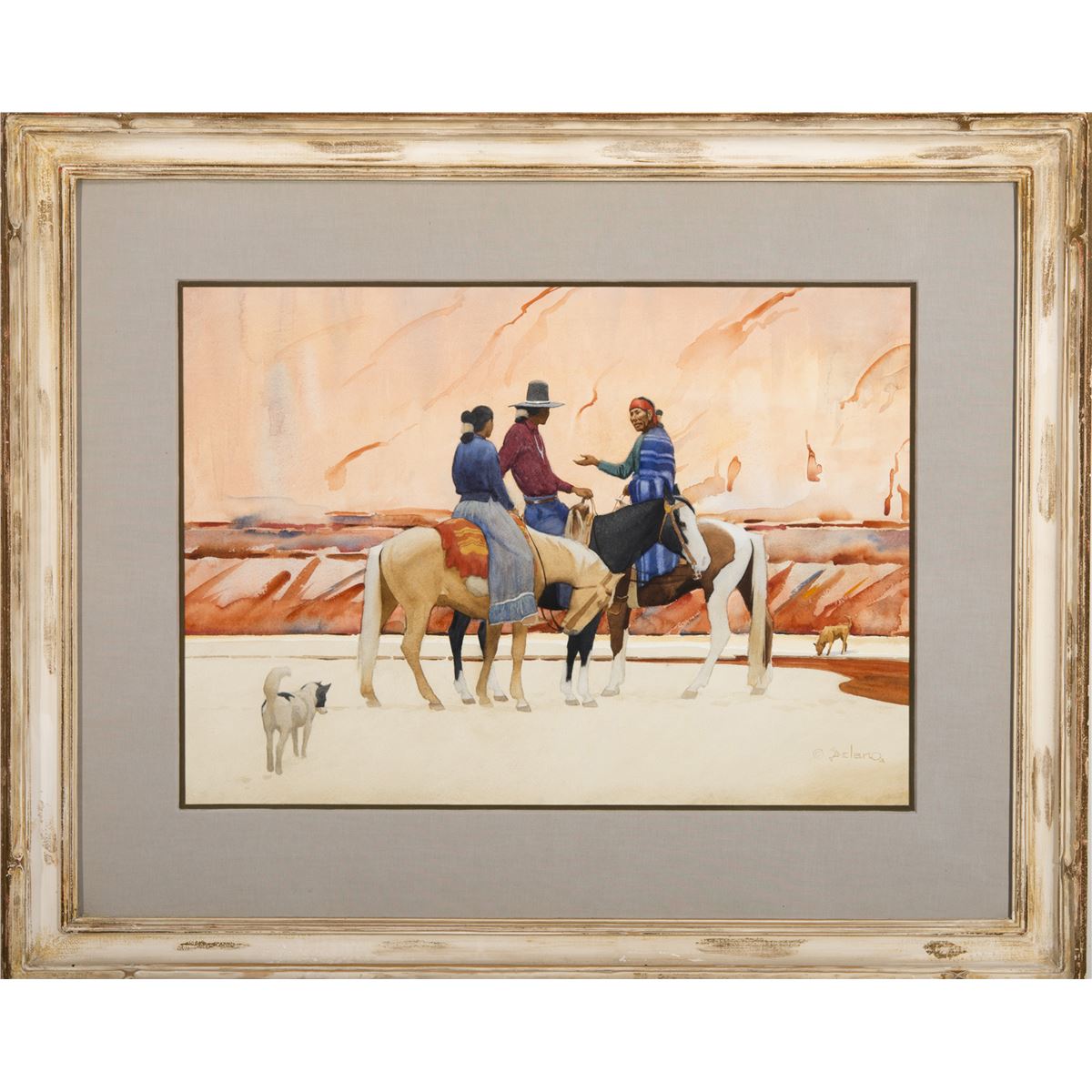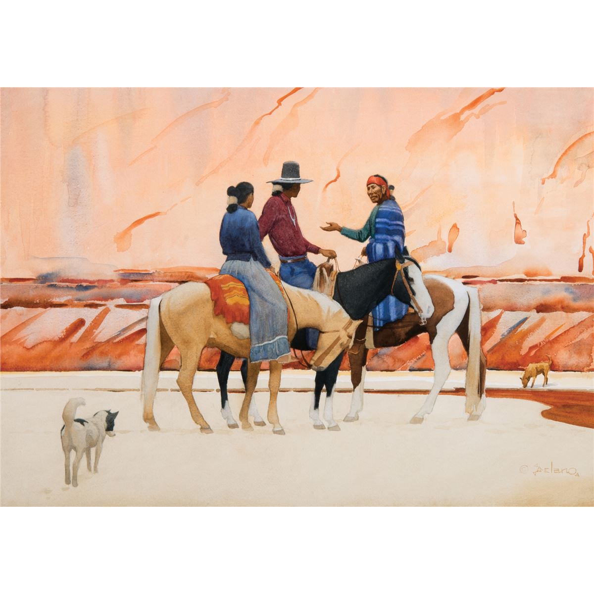 Gerard Curtis Delano filled his lonely childhood in Massachusetts with fishing, hiking—and drawing. No one thought much of his artistic ambitions, but Delano persisted, making his way to and through art schools in New Bedford and New York, where he embarked on a career in commercial art. The American West fascinated Delano and some of his earliest drawings had been of Indians. In the 1920’s, he finally went West, found a measure of success, then returned to the East Coast to study with N. C. Wyeth and Harvey Dunn. Delano then headed west for good. Settling in Colorado, he made his career, and fame, painting Native Americans—the Navajo in particular—and the history of the Old West. Lush masses, soft light, and beautiful contrasting colors animate Delano’s paintings.