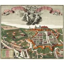 “Die Hochfürstliche Residentz Friedenstein und Haupt Stadt Gotha”. Gesamtansicht aus der Vogelschau. Altkolorierter Kupferstich mit prächtiger Wappenkartusche, Windrose und Legende bei M. Seutter, Augsburg, um 1750. - (Fauser 4796). Qu.-Gr.-Fol.