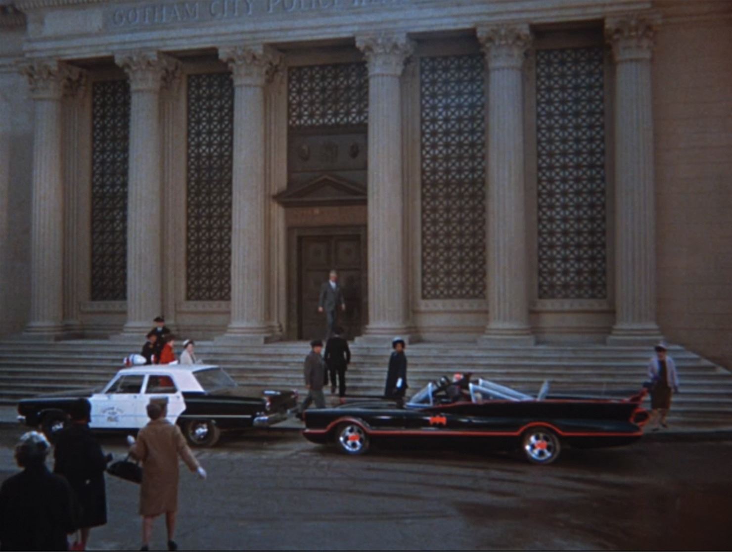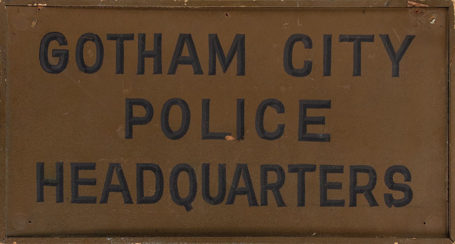 73. "Gotham Police Department" sign from Batman. (ABC, 1966-68) Vintage original police station sign constructed of solid wood frame with Masonite board face painted a dull golden matte to appear as aged bronze, with hand painted, "Gotham City Police Headquarters" in black and gray to appear as beveled edge. Measuring 34x 18 x 1.25 in. Exhibiting production wear and age with 5-in. splintered frame edge upper right, breach mid-board affecting text, edge and corner wear. In vintage good condition. $6,000 - $8,000