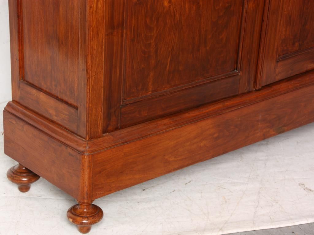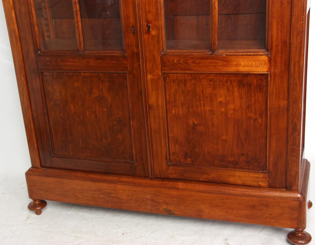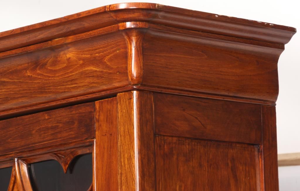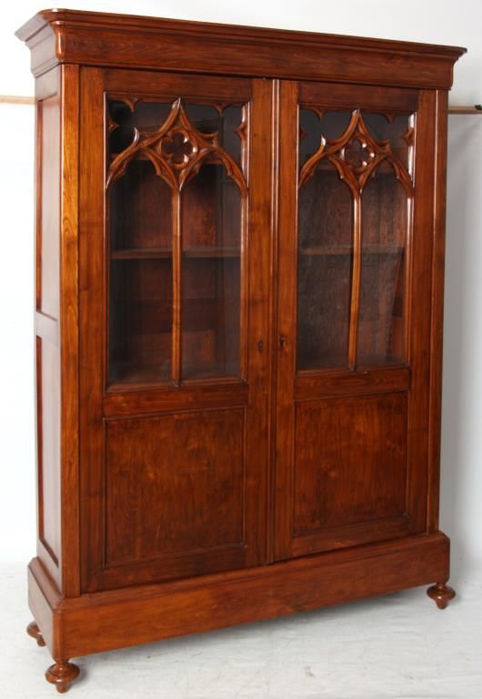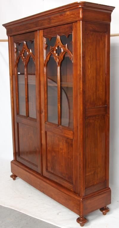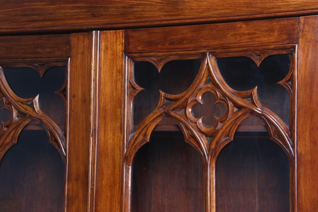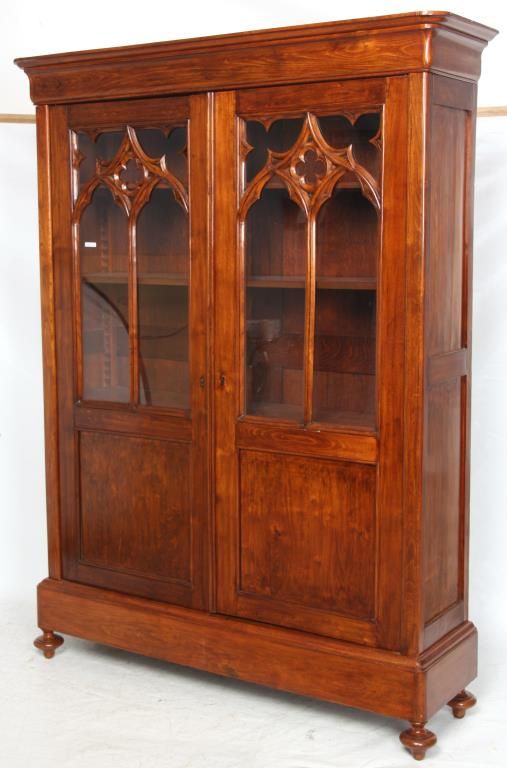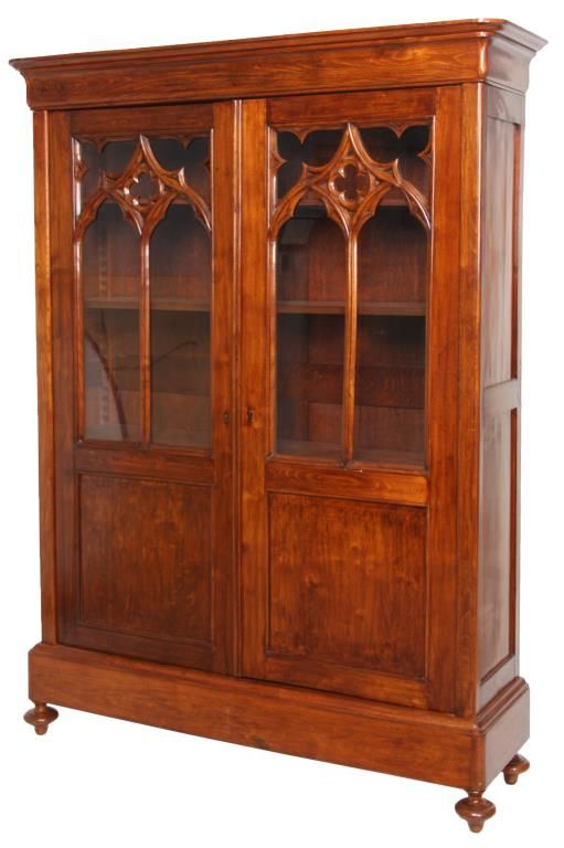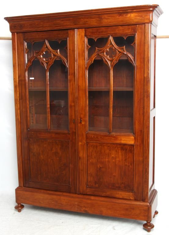 Gothic 2 Door Cupboard. Doors have large glass panels in the top with carved mullions tracing gothic arches, trefoil corner pieces and quatrefoil in the center with a large inset lower panel; stands on turned feet. Clean polished finish, circa mid-19th century, in good condition. 80.25 in. high x 58 in. wide x 12.75 in. deep.