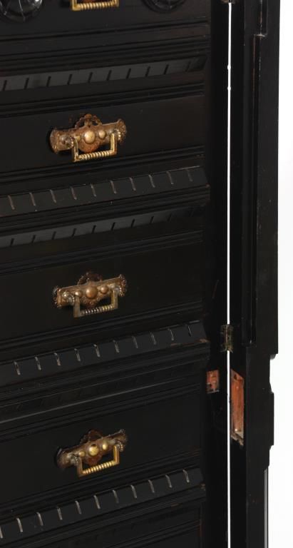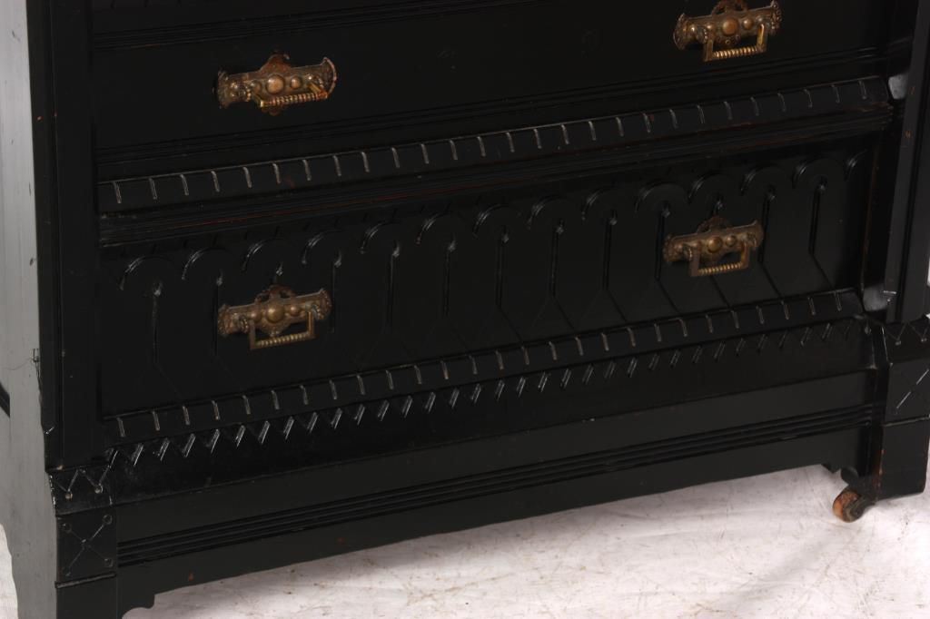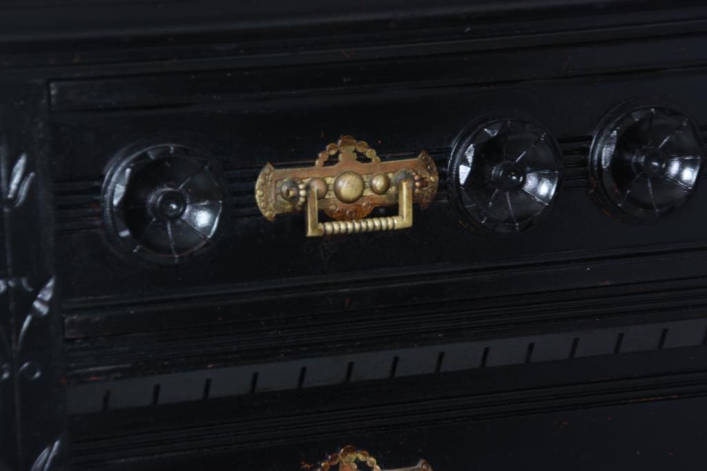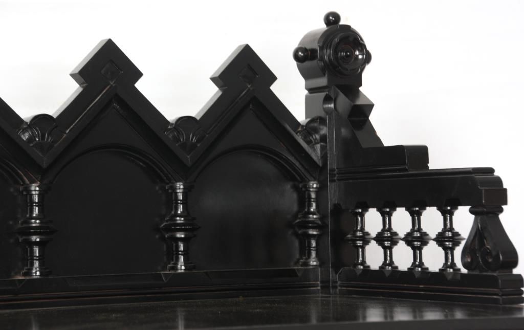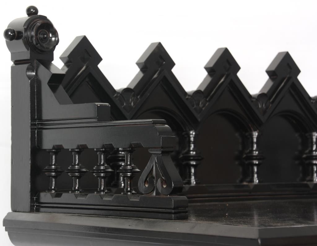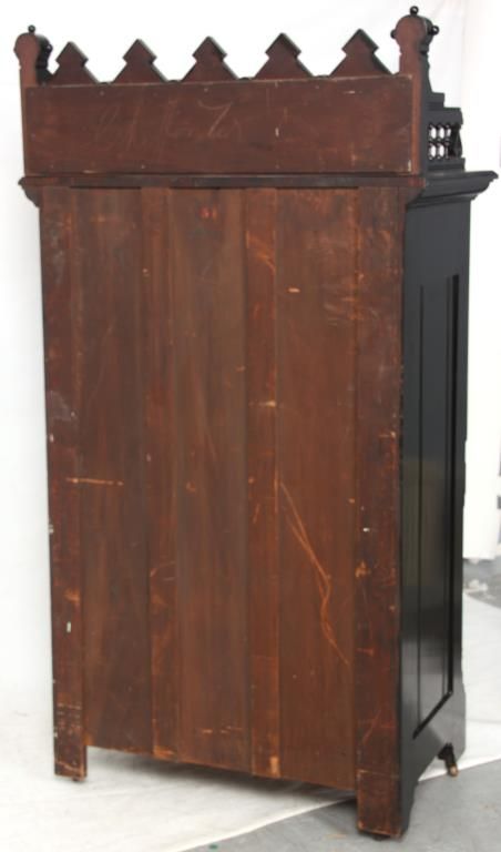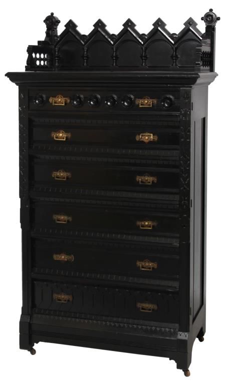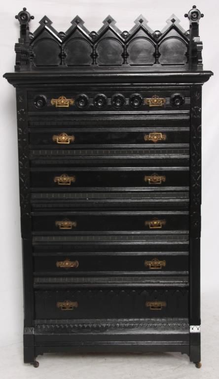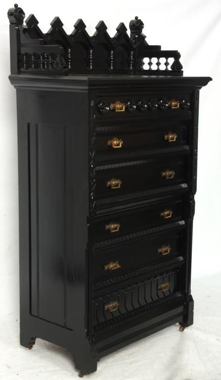 Gothic 6 Dr. Lock Side Chest. Carved gallery top with 5 peaks over arches and turned columns on the back panel, gallery has spindled side panels with scrolled spade designs and rosette finials on the corners with spherical mounts. The six drawers have beveled molding at the top and bottom with incised leaf carvings along the sides and large turned rosettes on the front of the top drawer, nice original brass pulls. In good overall condition, missing the lock mechanism, has an ebony lacquer refinish; numbered on the back with red 51 over black 3077. Measures 66 in. high x 36 in. wide x 20.25 in. deep