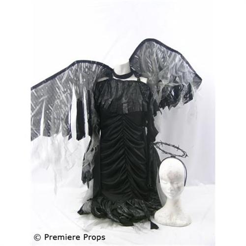 From David E. Kelley Productions - Women's Gothic Angel Costume w/ black w/ metallic black flowy detail off the shoulder dress, black w/ white tule wings, black thorny halo headband (fits size S-XL) (DEK1039)