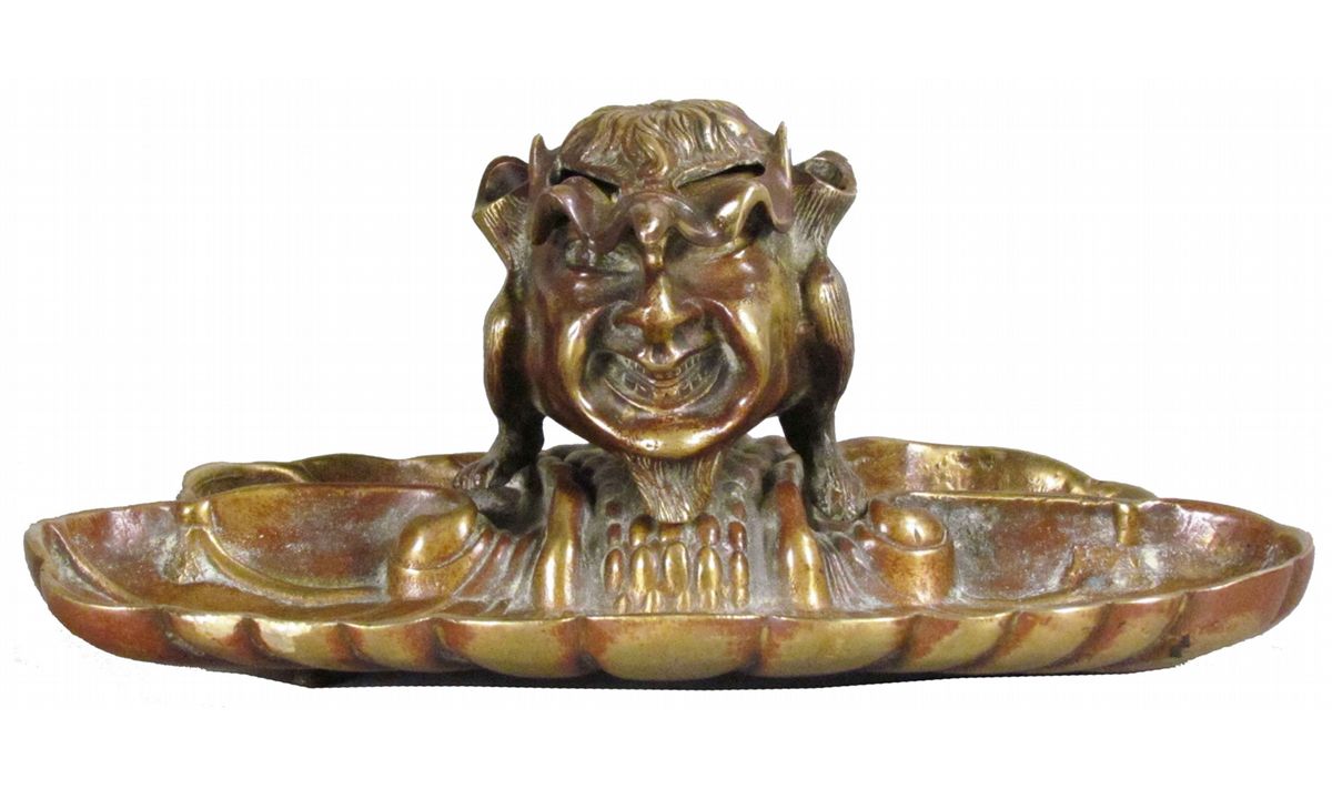 Brass Gothic Bird Masked Man Inkwell and Pen Holder. Very good condition. 8 1/2 X 3 1/2 X 5 1/2 inches.