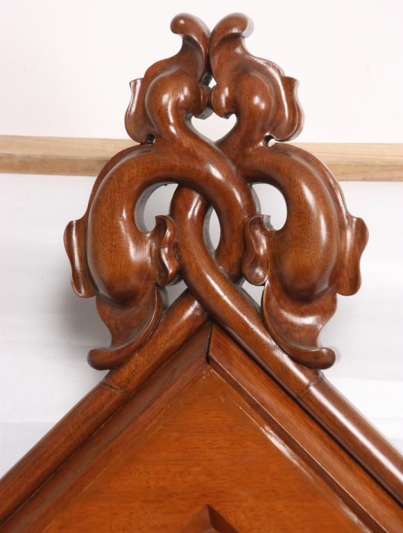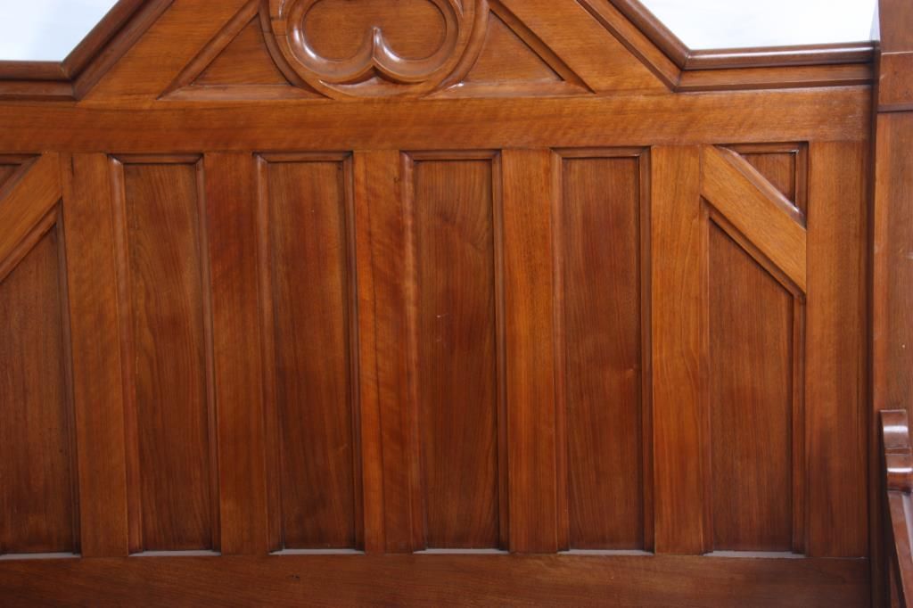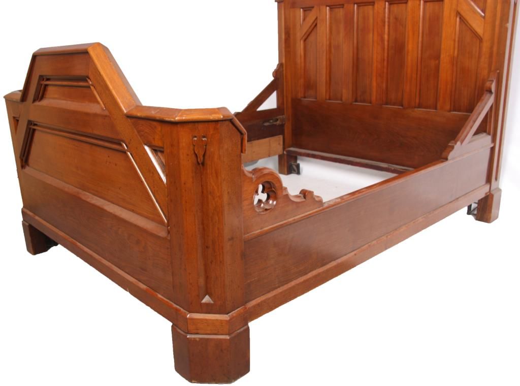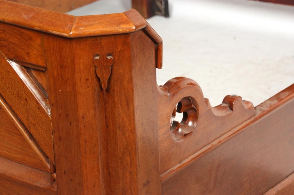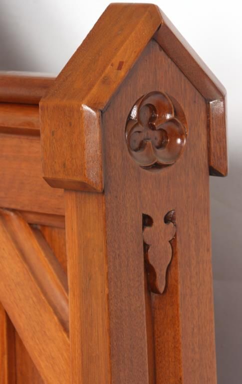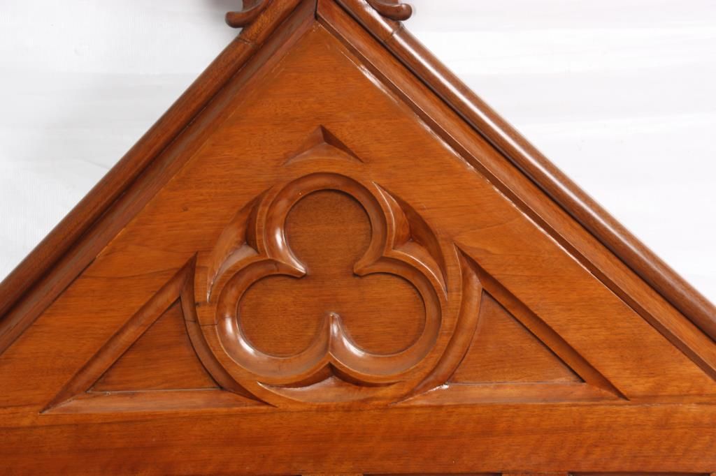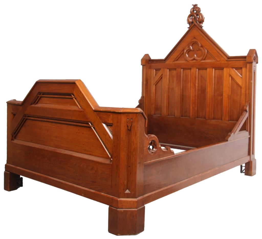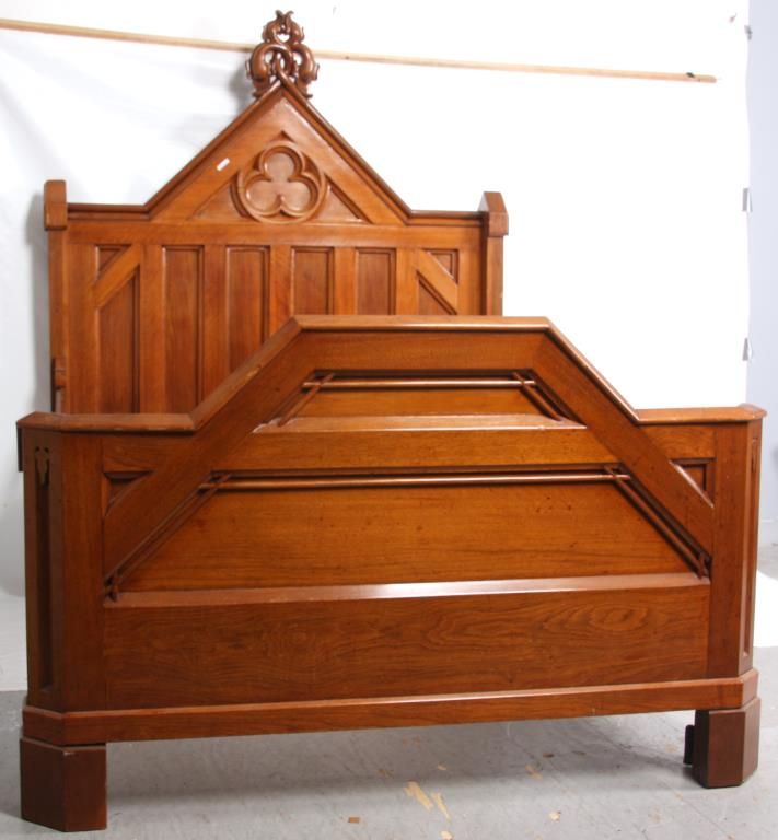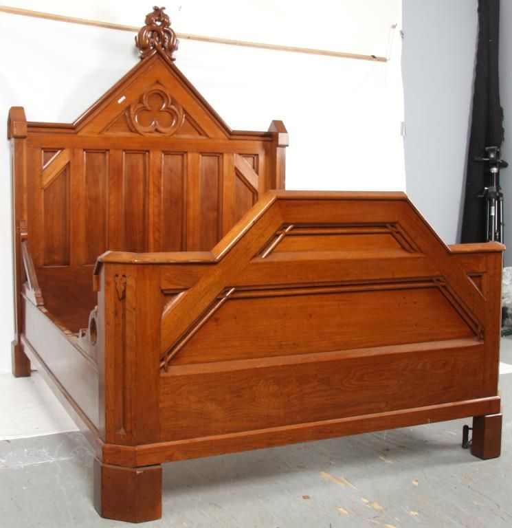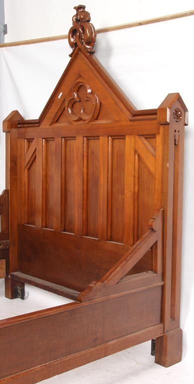 Gothic Carved Walnut Bed. Headboard has a high crest with twisted leaf carved top over an inset trefoil design and paneled backboard and footboard. In good condition, refinished. Mattress size: 58 in. wide x 70 in. long – Overall dimensions: 79 in. high x 62 in. wide x 78 in. deep