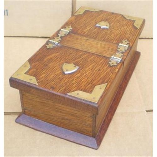 <p>Our latest container has just arrived from the UK, and this lot is from it. We have more extraordinary things that we'll be listing in the coming days and weeks, from the 17th century through the Georgian and Victorian periods to the Gothic Revival, Aesthetic, Arts & Crafts, Art Nouveau, Art Deco Movements and later. Be SURE to check out our other items!!!<p><p>This is another beautiful item,<p>An Original and Genuine<p>Antique English Victorian Gothic Revival Transitional to Arts and Crafts Mission Twin Hinge-Lidded Box, Possibly for Cigars, in Solid Quartersawn Oak, w/ Riveted Brass Mounts & Shield Appliques, Dating to c.1890..!<p>It is a beautiful box that features twin fold-flat lids each concealing wood-lined storage compartments, and each lid sporting Gothic brass hinges, shield applique and corner mounts.<p> The box measures 10" wide by 5" deep by 3" high and is in its original shellac finish.<p>This is a genuine antique Victorian cigar box -