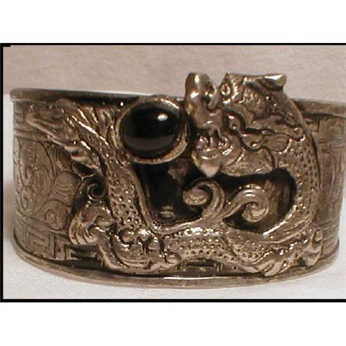 THis large dragon is guarding a black cabachon as he wraps himself around this wide cuff bracelet. The back of the cuff has two dragon faces on it. It is 1 1/2" wide and 6 1/2" long on the metal part with an additional 1" gap. It has good weight to it too. I am not sure of the silver content.