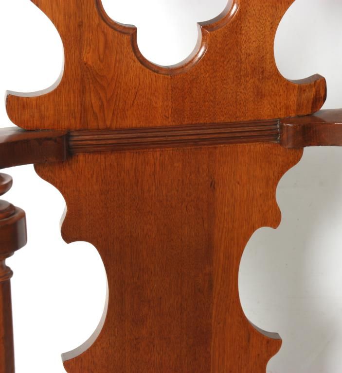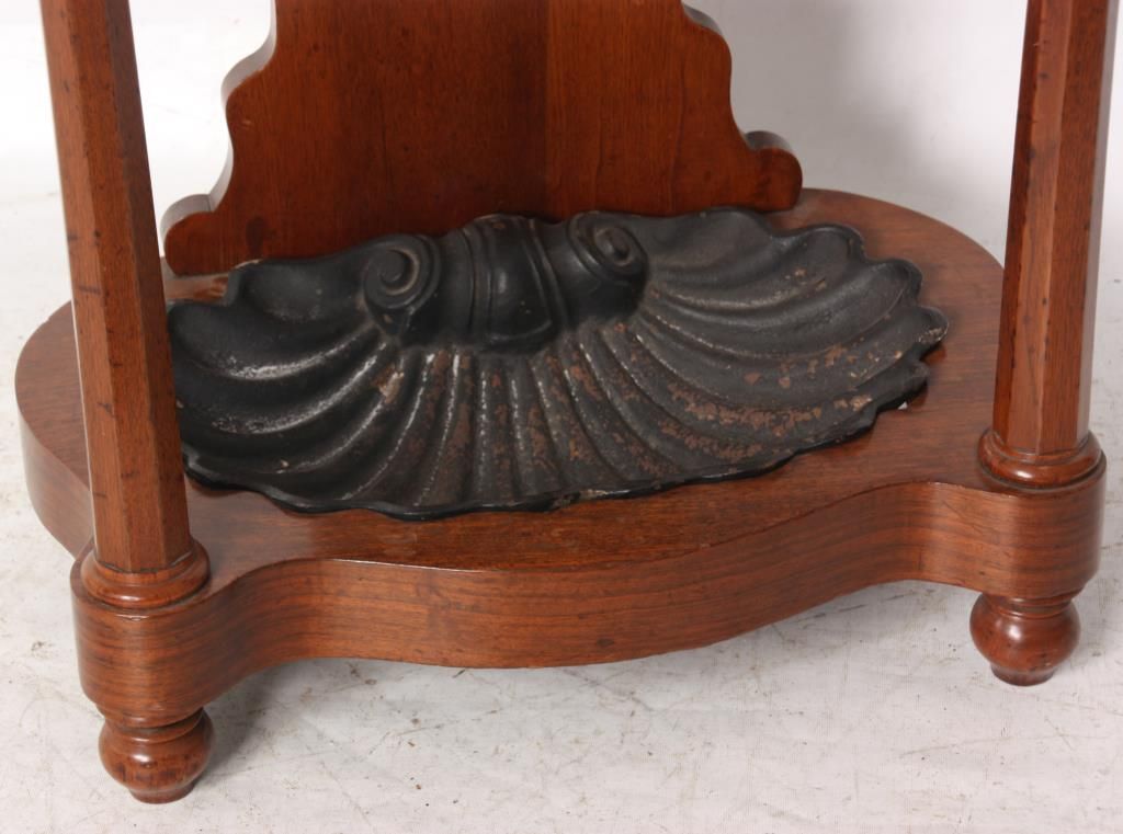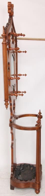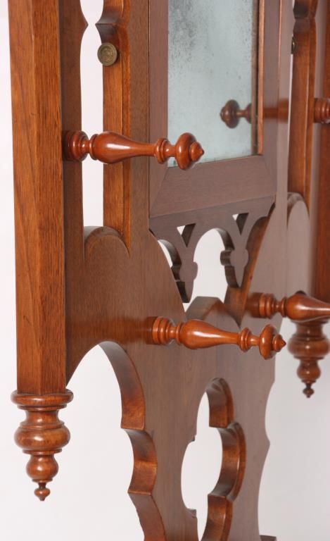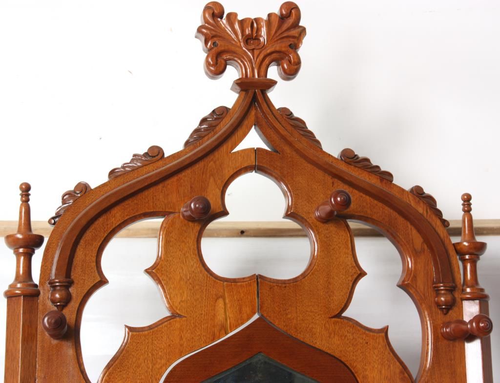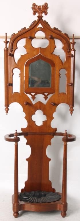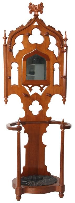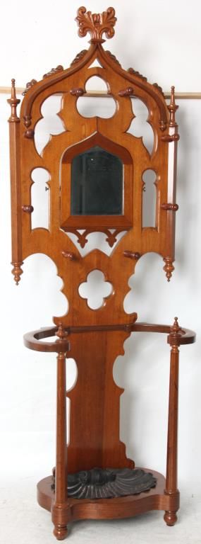 Gothic Revival Carved Walnut Halltree. Arched top has a plume style carved finial with filigree along the sides, pierced carved gothic forms in the back with 8 turned coat hooks and an arched swivel center mirror; has curved side arms with tapered octagonal posts, turned feet and finials and large cast iron shell-form drip pan in the base. In excellent condition with a French polished finish. 87 in. high x 30 in. wide x 16 in. deep.