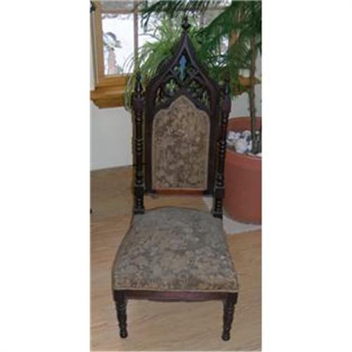This Unique chair is a Gothic Revival chair. The style of furniture began in England during the early 1800's. Furniture Designers such as Thamas Chippendale used this Gothic style in some of his furniture. The chair is holding it's original finish. The upholstery is also original to the chair. Replacement Cost $1450.00.