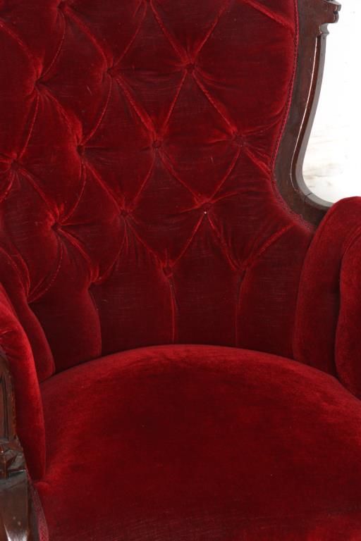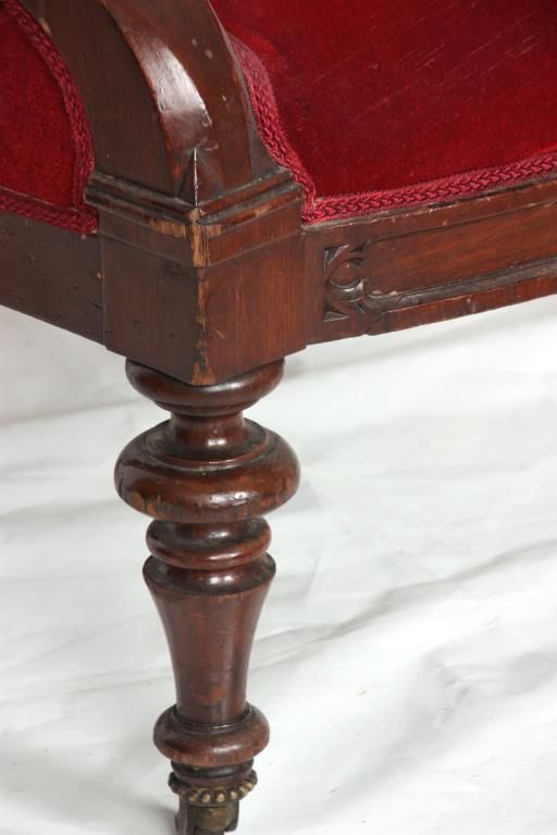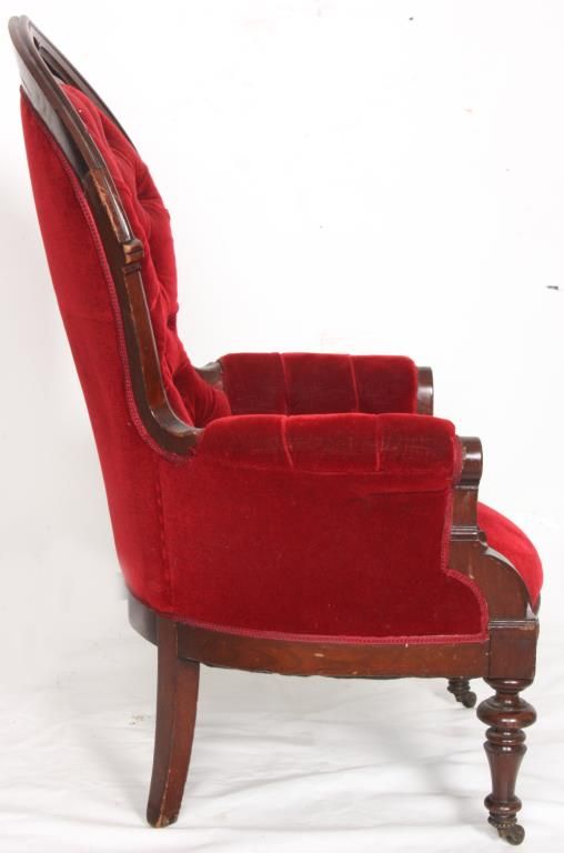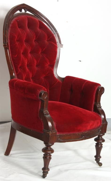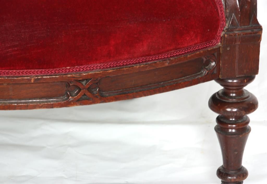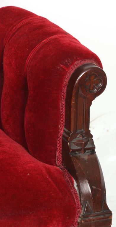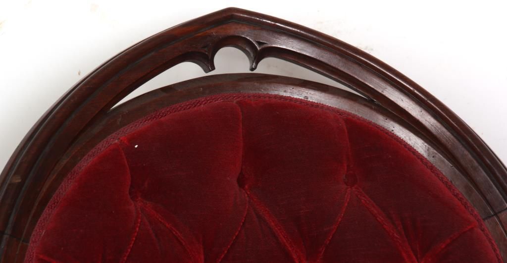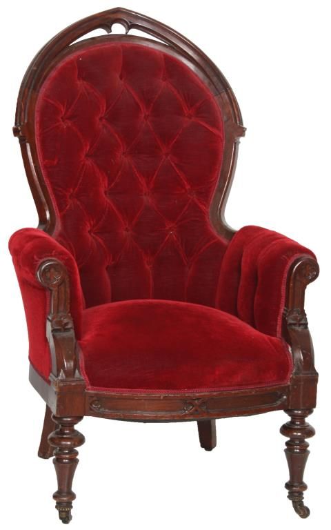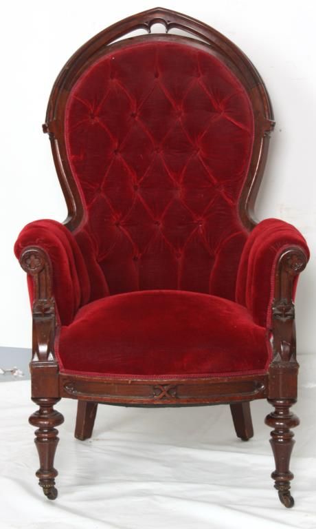 Gothic Walnut Parlor Armchair. Arched back has a pointed top with pierced carved crest, arm supports have carved quatrefoil designs at the ends and stands on turned front feet. In good condition and original finish. 44 in. high x 27 in. wide x 25 in. deep.