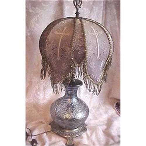 Custom dyed lace shade with Gothic cross theme and gold steel cut glass bead fringe.