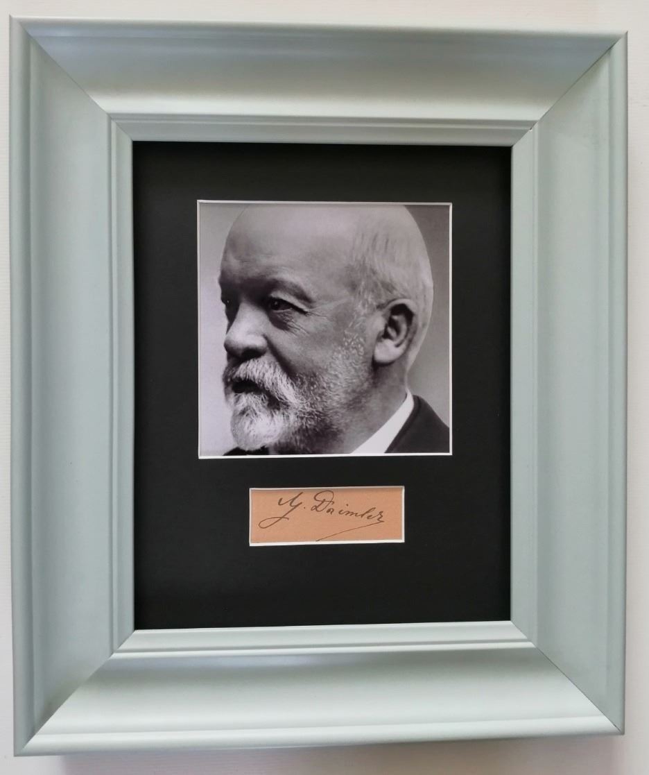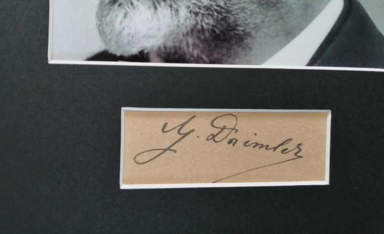 Gottlieb Wilhelm Daimler was a German engineer, industrial designer and industrialist born in Schorndorf, in what is now Germany. He was a pioneer of internal-combustion engines and automobile development. He invented the high-speed liquid petroleum-fueled engine. Gottlieb Daimler signature mounted and framed (In a different frame of shown). Supplied with coa.