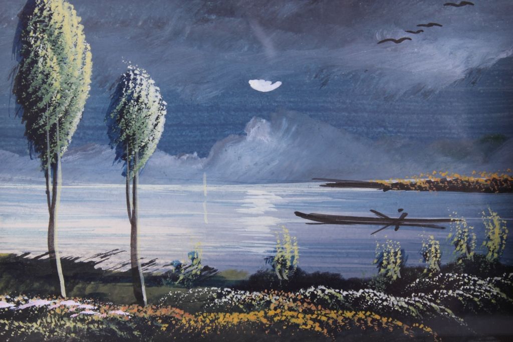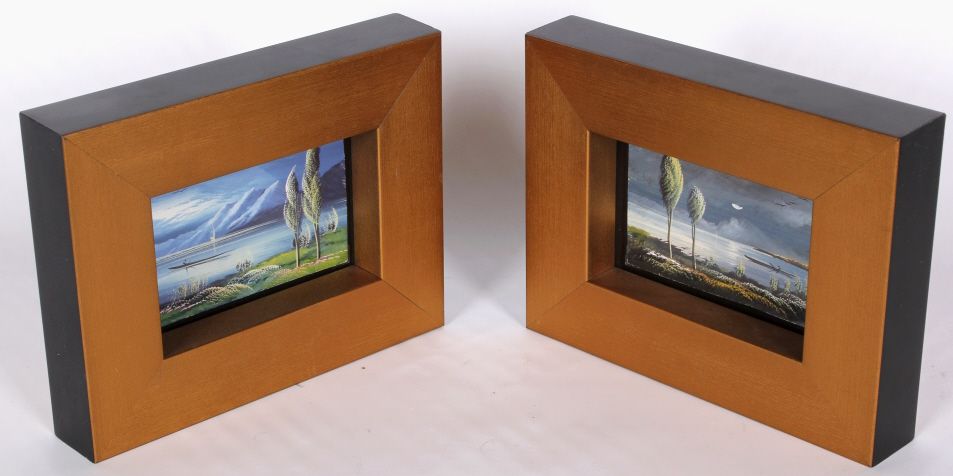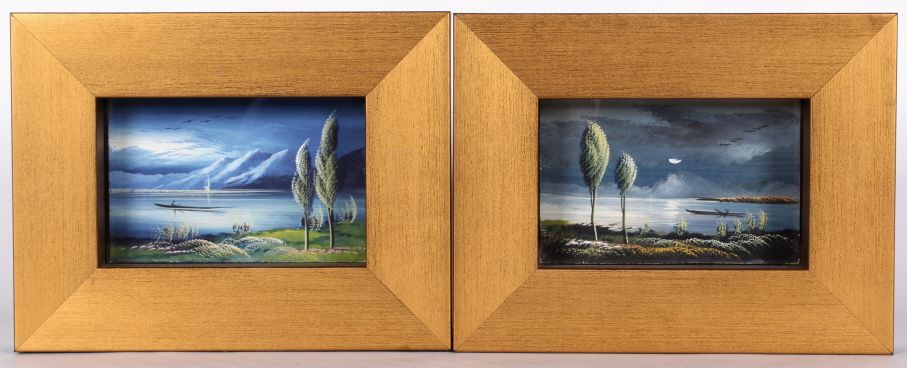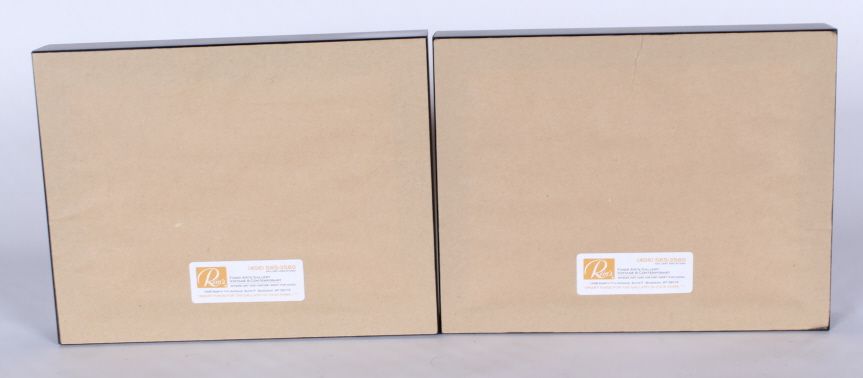 The lot features a pair of Asian . These are boxed frame Gouache hand painted art deco postcards from Japan. These are from the 1920's and are unsigned and never used. These are a set and by the same original artist and sell together. The frame measures 6.875"x8.875" and the artwork is 3.375"x5.375"
