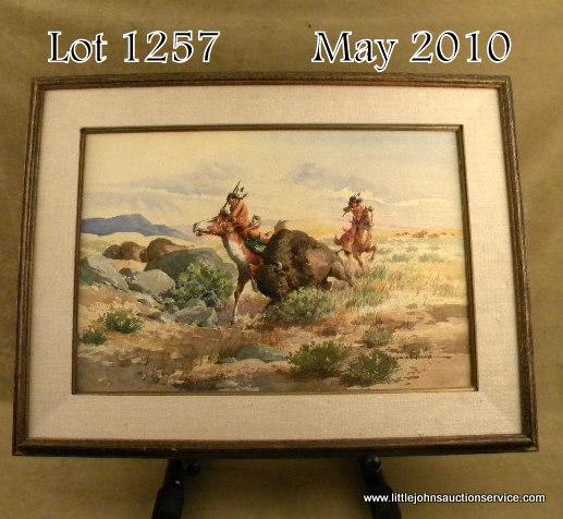 Gouache and water color on board portraying Indian braves hunting buffalo. Approx. 15" by 21-1/2". Nicely framed and matted. Signed "Lloyd Harting". Lloyd Harting was born in 1901, attended the Chicago Art Institute, was well known for hiscalendars published by Brown & Bigalow. He passed away in Orange County, CA in 1974. His Western works of the postwar era are popular and have a good sales record up to $10,000 at auction. Est: $1,500 - $3,000