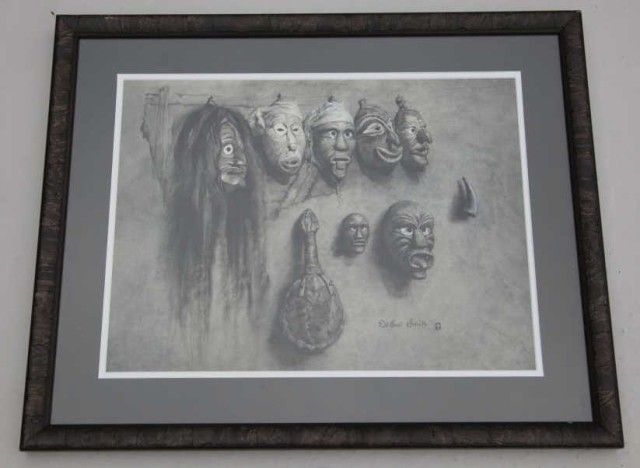 Gouache in black and white of Indian ceremonial masks and tortoise shell rattle signed lower right De Cost Smith. Approximately 15”x20” in fine condition recently framed, cleaned and matted. De CostSmith was born in New York in 1864 and died 1939. He studied at Academic Julian in Paris. He grew up near Skaneateles in Western New York where he became well acquainted and initialed into the Gnondaga Tribe. Hetraveled to Dakota Territory in 1884 where he created articles and illustrations for outdoor magazines. He worked with Edward Willard Deming and was well regarded for his works portraying authentic Native AmericanCulture. Est.; $1,000-$2,000