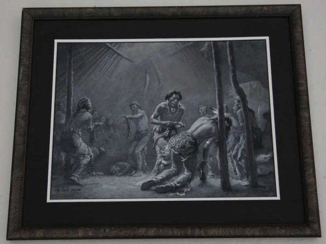 Gouache in black and white of “The Sundance” signed lower left De Cost Smith. 15”x20” in fine condition recently framed, cleaned and matted. De Cost Smith was born in New York in 1864 and died 1939. He studied at AcademicJulian in Paris. He grew up near Skaneateles in Western New York where he became well acquainted and initialed into the Gnondaga Tribe. He traveled to Dakota Territory in 1884 where he created articles andillustrations for outdoor magazines. He worked with Edward Willard Deming and was well regarded for his works portraying authentic Native American Culture. Few white men were allowed to see the secret ceremonial rituals of the Sundance. Est.; $1,750-$3,500