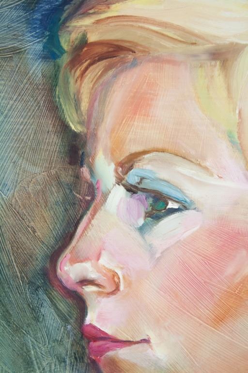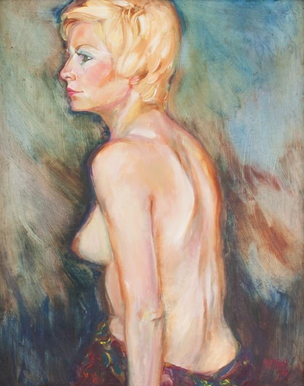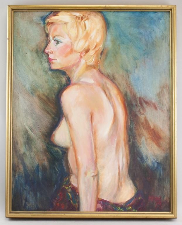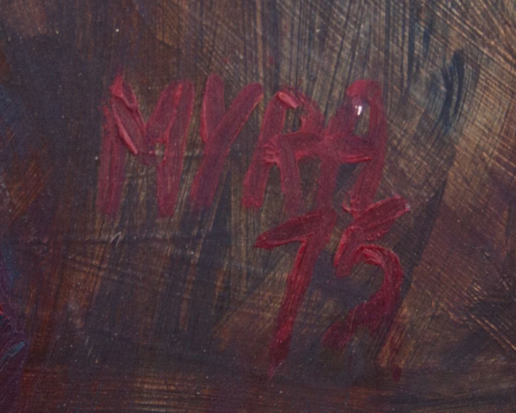 Gouache on board,framed. Featuring portrait of a half-nude woman. Signed "MYRA" to the bottom right corner, with "75" inscribed beneath the signature. Board size: 75 x 60 cm (29.5 x 23.5 inches). Frame size: 82 x 65 cm (32.25 x 25.5 inches).