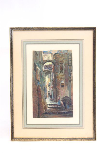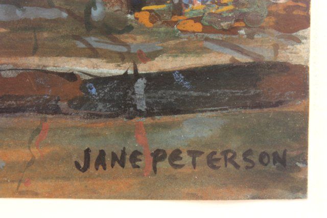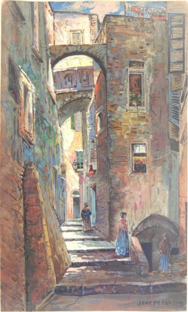 "Village Steps", framed, signed lower right Jane Petersen American artist 1876 - 1965. Image approx. 7" x 12", frame 15" x 20". Please read our terms of sale.