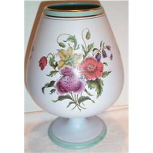This fantastic Floral Decorated Footed Vase is in SUPERIOR condition with no chips, cracks, dings or hairlines and it measures 6" in diameter and stands a very stately 8.50" tall. It is marked on the bottom with the familiar Gouda Logo.