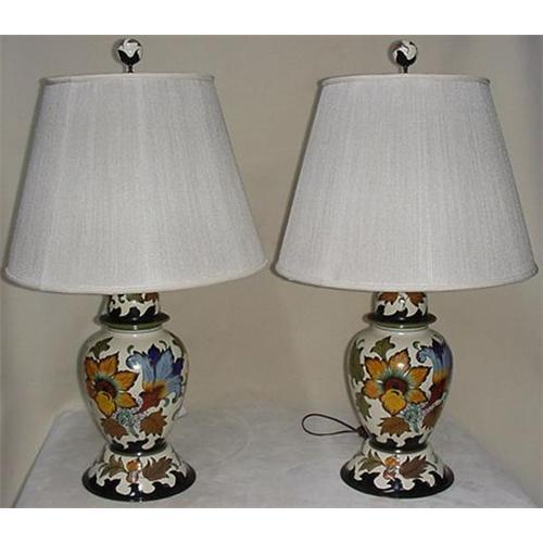 A pair of Gouda pottery ginger jar lamps, 15" tall to top of jar, overall height is 32" tall with finial. The wood bases are painted to match the vases as are the finials. The shades are silk cord, I don't usually include shade because they are troublesome to ship, but these are beautiful and in good clean condition. The condition of the ginger jars is very good, no chips or cracks. (20)