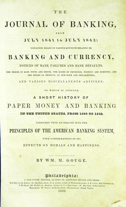 Gouge, Wm. M. A SHORT HISTORY OF PAPER MONEY AND BANKING IN THE UNITED STATES, FROM 1690 TO 1832... Philadelphia: J. Van Court, Printer, Quarry St., Between Second and Third, 1842. As published in the Journal of Banking. 8vo, contemporary marbled boards reinforced at spine and corners with later dark tape. Title leaf; index leaf; 412 pages. Front hinge reinforced at title; some light chips to opening leaves. Very good. A complete set of this rare and important publication, which publishes Gouge’s classic work on American paper currency serially as part of the Journal of Banking. Gouge wrote his Short History of Paper Money in 1831 and 1832, and originally published it in 1833. Written largely from a financial perspective, Gouge’s work includes the first review of what Eric Newman referred to as “the eighteenth century American paper money experience.” The work is also of numismatic value because of the detailed description it gives of the organization of state banks. American Imprints 2727 (for 1842). Lomazow 405. Sabin 28073. Clain-Stefanelli 13482 and McKerchar 2075, both citing an 1840 edition.