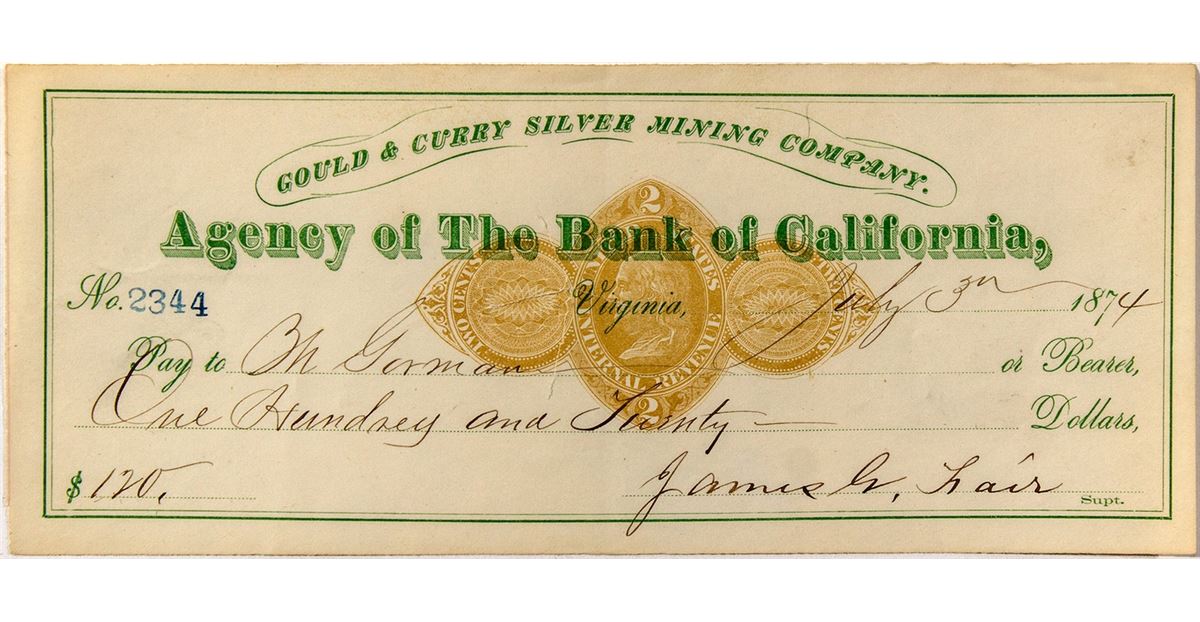 Agency of The Bank of California, Gould & Curry Silver Mining Company. July 3rd, 1874. Rare "buff" RN-D with James G. Fair's signature as superintendent. Cut cancel, otherwise nice. (Prag Collection)