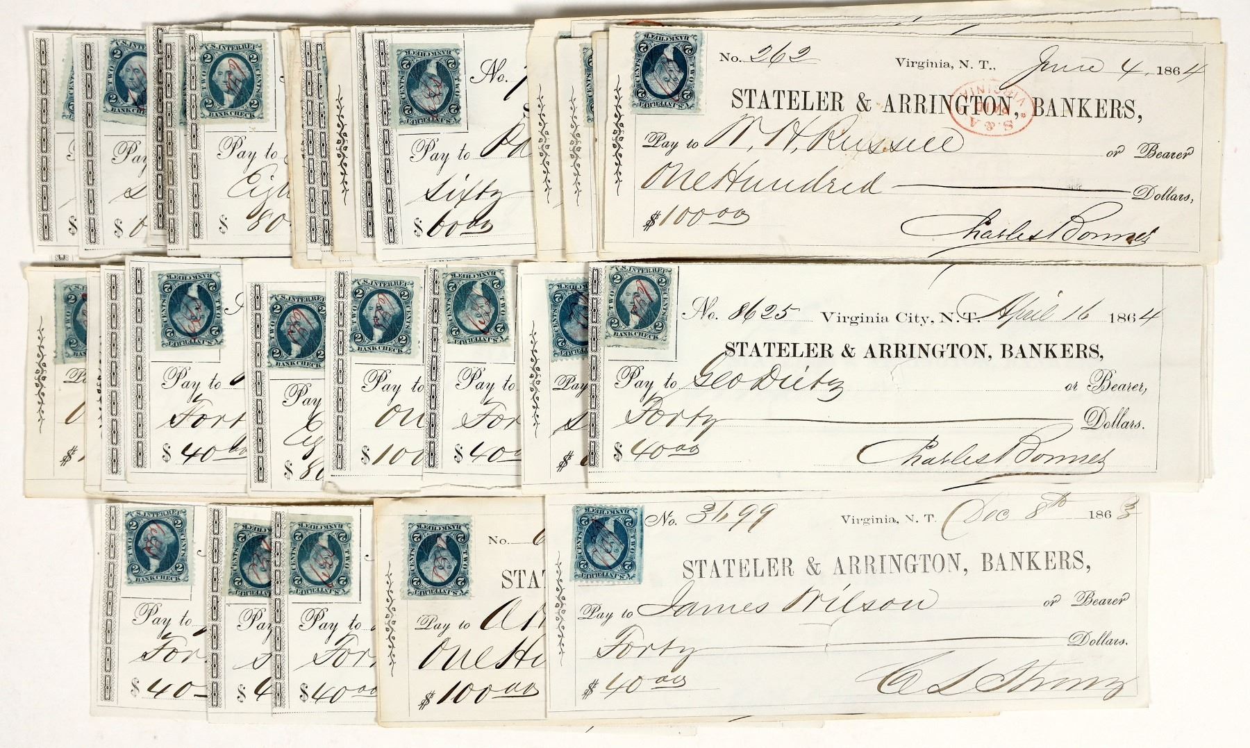 Lot of 50 issued territorial checks. Half are for mine workers, half for mill workers (all listed in the 1864 Collins VC directory, available online for free). Mix of supt. signatures: both Charles Strong and his successor Charles Bonner. Includes some with red Stateler & Arrington cancel. Great mini archive for confirmed employees of this important VC mine! Please inspect.