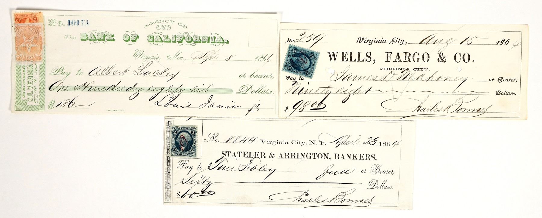 Lot of 3 different Gould & Curry checks on three different bank checks. Includes: Stateler & Arrington (1864) signed by Charles Bonner; Wells Fargo & Co. (1864) signed by Bonner; and Bank of California (1866) signed by Louis Janin, with NV and US IR stamps. Wells Fargo was established very early in the Comstock. Stateler & Arrington failed in 1864, and the Bank of California moved in.