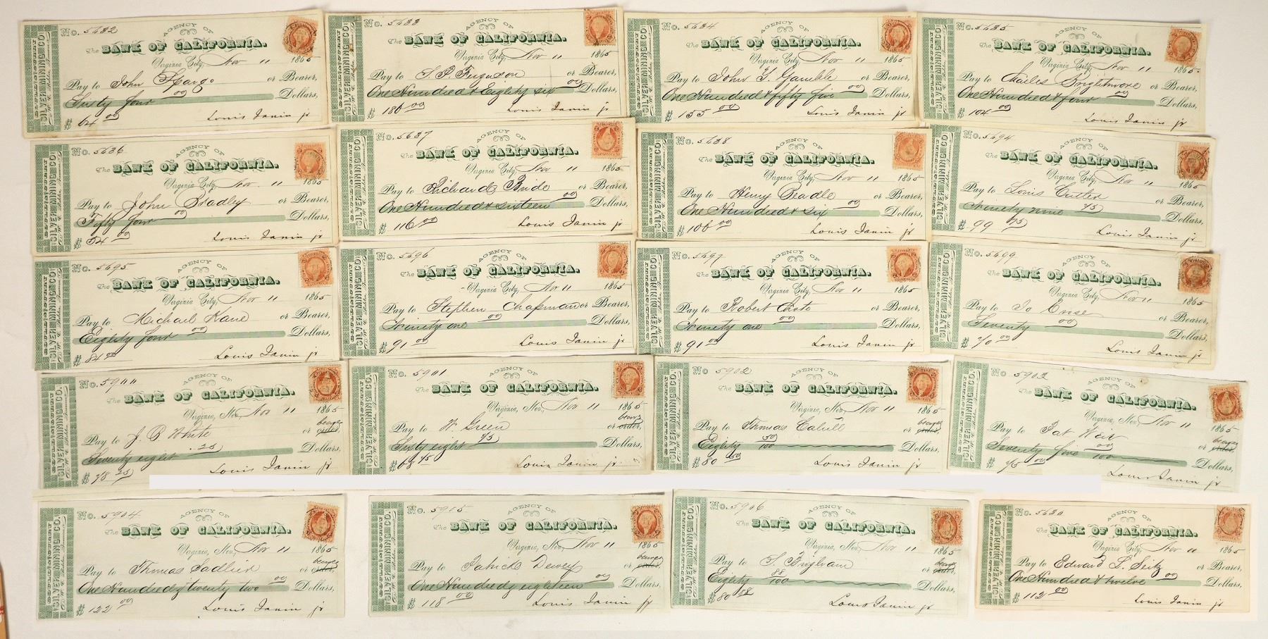 Lot of 20 Bank of California checks for the Gould & Curry signed by Louis Janin as supt. All have a US IR stamp. Janin was a prominent mining engineer who was educated at the Freiburg School of Mines. Before coming to the Comstock, he worked for the Enriquita Quicksilver Mine near San Jose, California. He began his work on the Comstock at the Mexican Mill and sought to increase silver extraction that was being lost in the slimes and tailings. Using a modified Freiberg barrel amalgamation process, he was successful in profitably re-working the tailings at the Gould & Curry Mill. He was put in charge of the Gould & Curry Mine in 1866, when it was struggling. (See: https://www.mininghistoryassociation.org/Journal/MHJ-v3-1996-Spence.pdf for a nice history of the Janin family and their many mining projects]