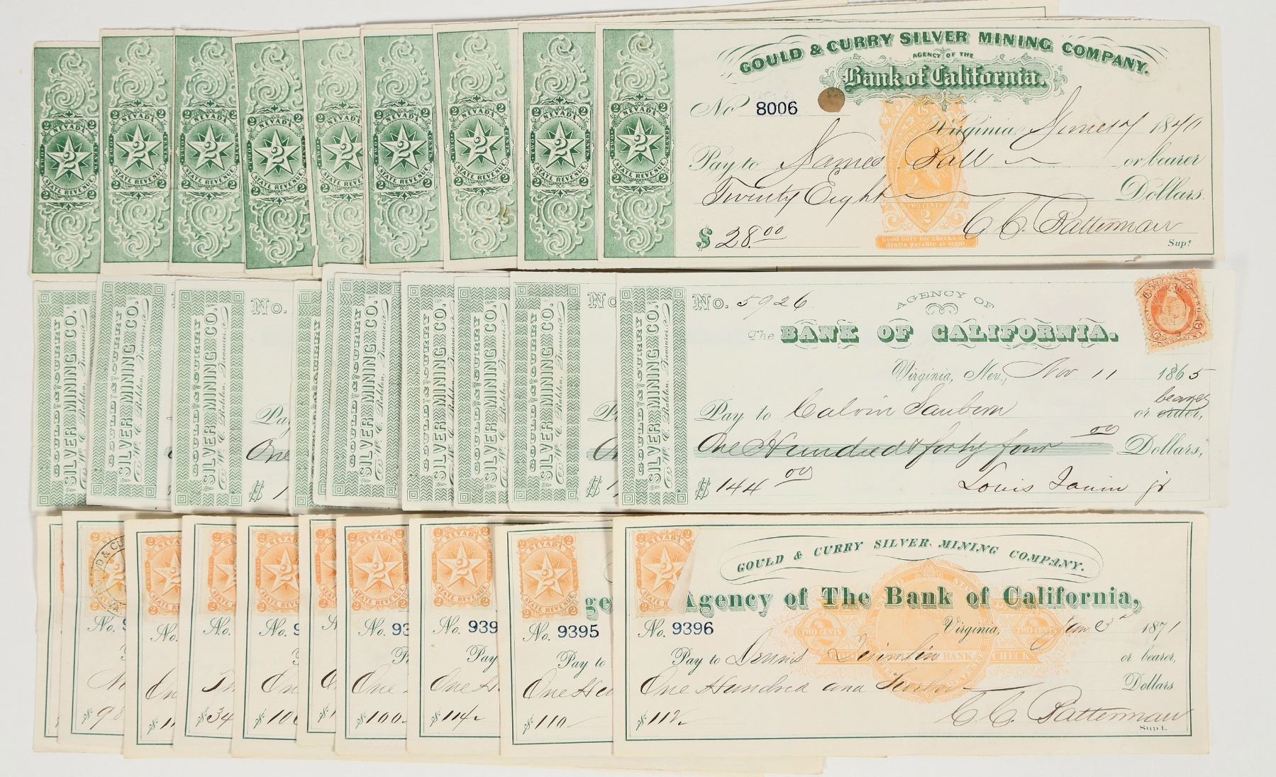 Lot of 30, ten each of 3 types. 1-10) Ten Bank of California 1870 checks with RN-B and printed green NV stamp, signed by CC Batterman as superintendent. 11-20) Ten Bank of California 1865 checks signed by Louis Janin as supt., with US IR stamps. 21-30) Ten Bank of California 1871 checks with RN-C and orange NV adhesive stamps, signed by Batterman, two with tied cancels.