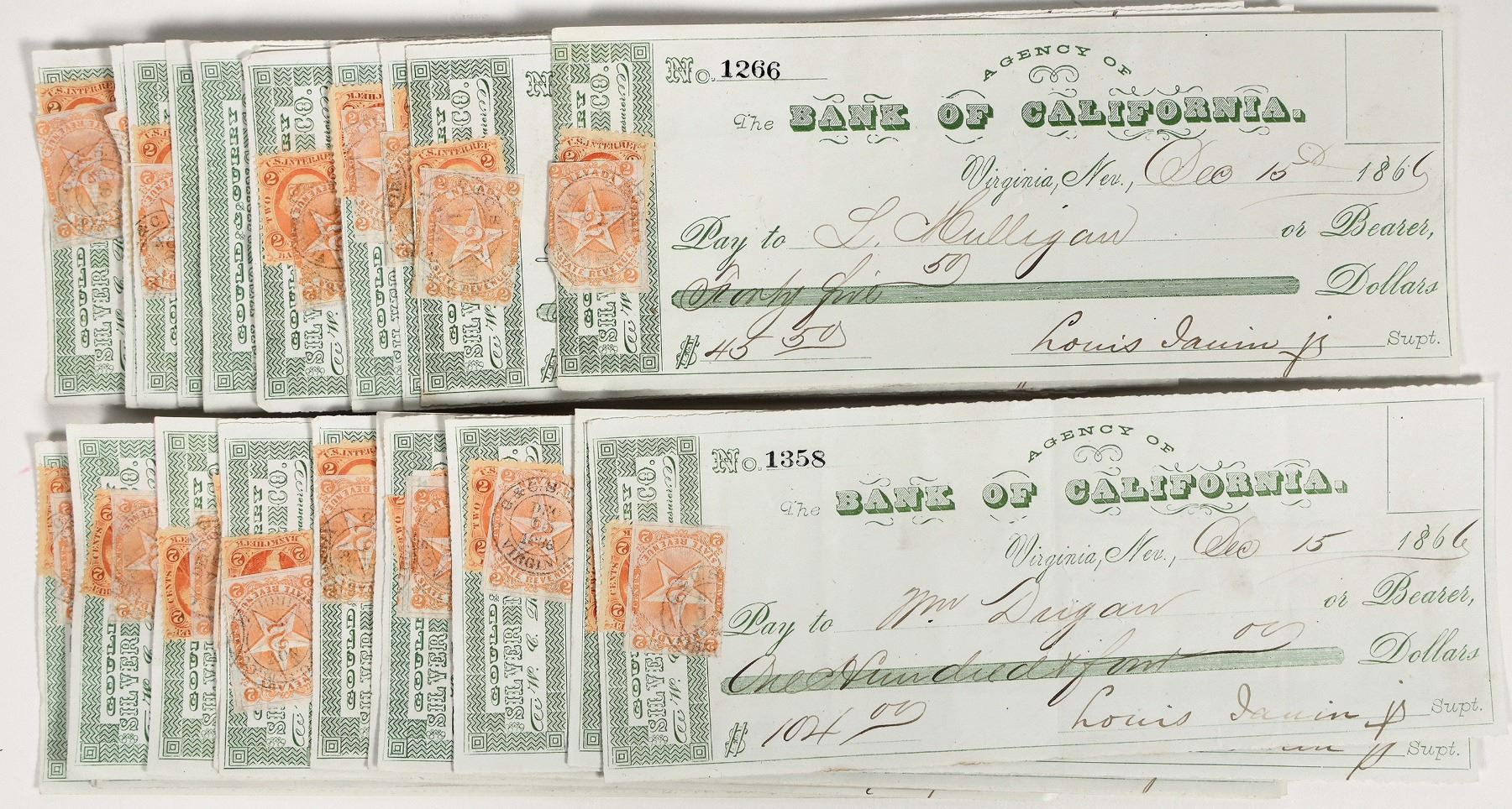 Lot of about 29 checks issued to possible Irish miners (based on their surnames). All checks signed by Louis Janin as supt. and include a US IR and Nevada adhesive stamp. At one time in the 1860s, about one third of miners on the Comstock were Irish or Cornish.