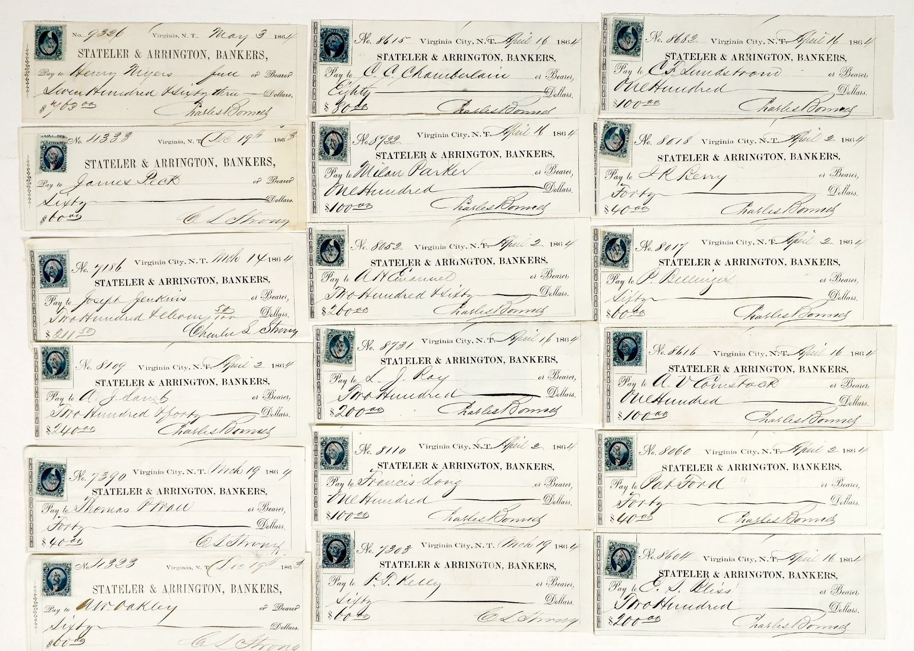 Fantastic group of 18 checks issued to the assay employees of the Gould & Curry Mill in 1864. This mill was built at considerable cost in 1862 and located at the confluence of Sixmile and Sevenmile Canyons. By the end of 1863, approx. $900,000 had been spent. Charles Strong was replaced as supt. by Charles Bonner, and the mill was reconstructed for a cost of $560,000. It used both stamping mills and a variant of the Washoe Pan Process (Veatch Process) along with Spanish style Patio Process. In 1866, it had 80 stamps and a 100-ton-a-day capacity. In 1871, the mill was sold to Parke & Bowie, but shutdown soon after. This collection includes checks to all different employees, all listed in the Collins 1864 directory, including: AW Oakley (previously unknown assayer), ES Bliss (smelter), Joseph Jenkins ("ore shipper"), and then 14 different amalgamator employees. Amalgamation is the process of extracting the gold and silver using mercury. This is a special collection that was assembled from the larger Comstock check archive!