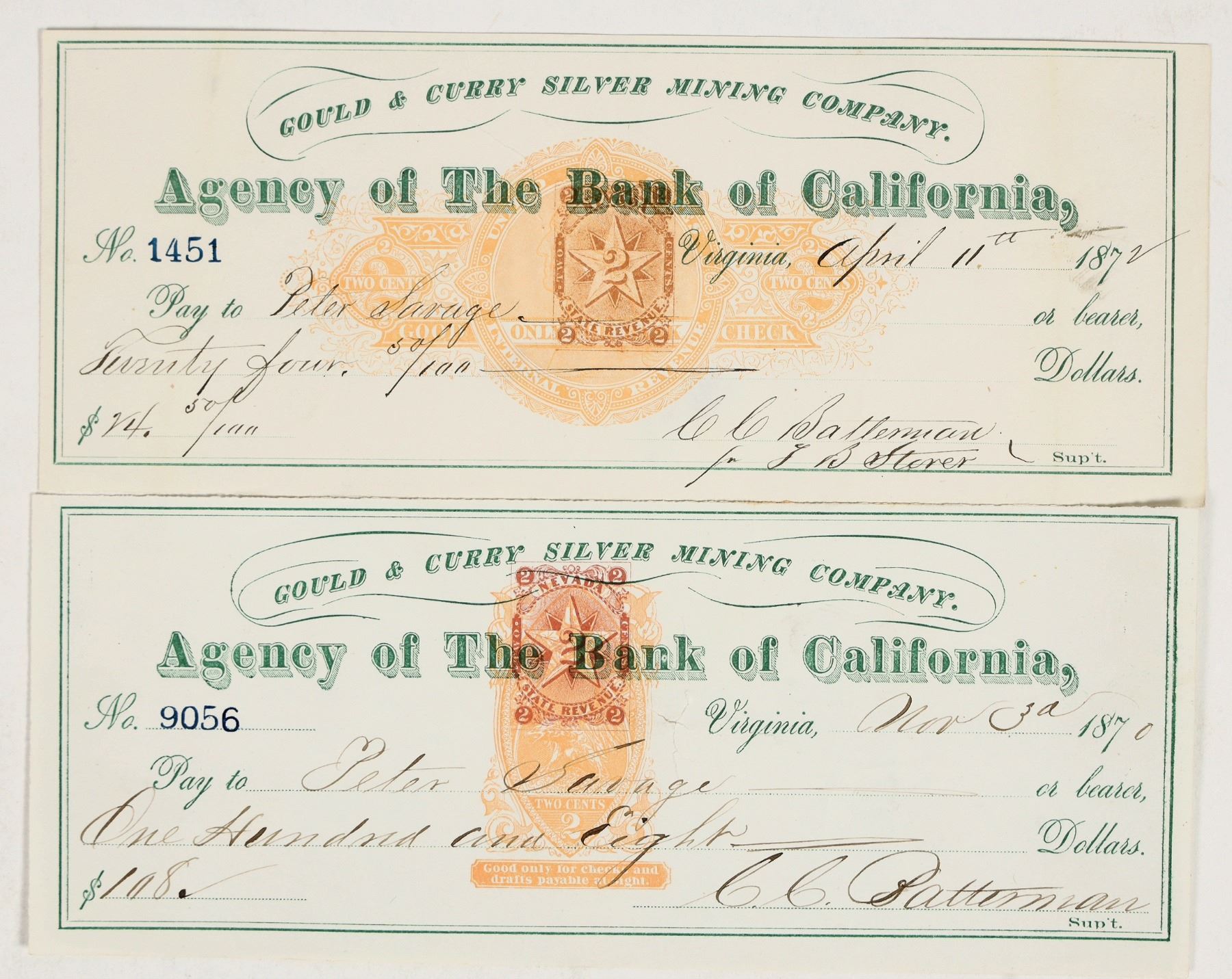Lot of 2 different. Both are issued to Peter Savage, a miner for the Gould & Curry. Both have rare imprinted revenues. 1870 with RN-B17b and 1872 with RN-C21b, both signed by CC Batterman.