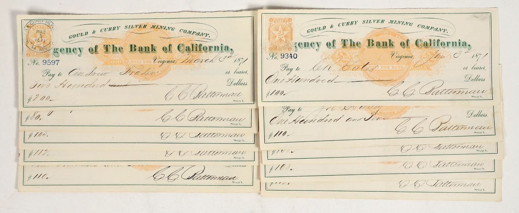 Lot of 10 checks issued in 1871 and signed by CC Batterman as supt. These checks have RN-C imprinted revenue plus orange Nevada adhesive stamps (most with tied cancels). Great resale lot! C.C. Batterman served as superintendent of the Gould & Curry, Crown Point, and Imperial Mines on the Comstock Lode in the early 1860s and later became Nevada's second State Treasurer in 1869. He also served as warden for the Nevada State Prison. In 1881, he died at the young age of 53 from heart disease after moving to Tombstone to oversee mining interests there.