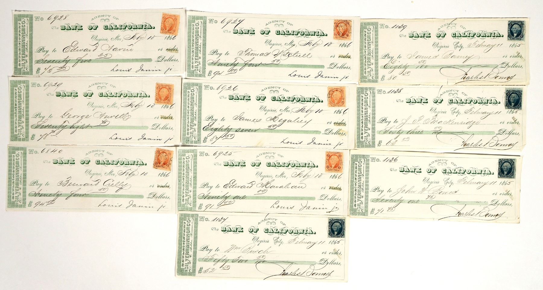 Lot of 10, issued 1865-1866. These are the green Bank of California checks that list WC Ralston as treasurer. Four are signed by Charles Bonner (1865) and six are signed by Louis Janin (1866) as superintendent. All have a US IR stamp attached. This was the beginning of a tough time for the Gould & Curry, and the Comstock overall was approaching a decline in the late 1860s. The Gould & Curry had experienced a boom earlier in the 1860s.